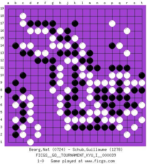 Last move : 1-0 2012 September 28 8:55:0 [Event "FICGS__GO__TOURNAMENT_KYU_I__000039"] [Site "FICGS"] [Date "2012.01.16"] [Round "1"] [Black "Bearg,Nat"] [White "Schub,Guillaume"] [Result "1-0"] [Rating 1 "0724"] [Rating 2 "1278"] 1.d3 d16 2.r4 r16 3.k10 d5 4.c10 c3 5.k17 p17 6.r11 e3 7.d2 e2 8.c4 d4 9.b3 c2 10.c5 d6 11.c6 k4 12.k3 j3 13.l3 j4 14.j5 l4 15.m3 l6 16.l5 m5 17.k5 h5 18.j6 h6 19.j7 m4 20.n3 c14 21.d17 c17 22.e17 e16 23.f17 f16 24.g16 g15 25.h15 h16 26.g17 h14 27.j15 g14 28.g12 r13 29.p14 q14 30.r7 h7 31.h8 g8 32.g9 j8 33.k7 h9 34.k8 p4 35.p3 o5 36.p5 o4 37.o3 q4 38.q5 q3 39.r3 r2 40.o6 n6 41.n4 n5 42.n7 o7 43.p6 m7 44.n8 m8 45.k9 n9 46.o8 o9 47.p7 m10 48.l9 m9 49.m11 l11 50.k11 p8 51.o7 r9 52.q9 p9 53.q8 q10 54.q11 r10 55.p11 p10 56.n11 l10 57.l12 r8 58.q7 s5 59.s6 r5 60.s4 s3 61.r6 t4 62.s8 s9 63.t8 t6 64.t10 t9 65.c13 d14 66.d13 e13 67.e12 f13 68.f12 c7 69.b7 b8 70.c8 d7 71.b9 b6 72.b2 d1 73.a8 b4 74.j13 j14 75.k14 l13 76.m13 k12 77.m12 j12 78.k13 k15 79.j16 l14 80.h13 h11 81.g10 h10 82.g11 c18 83.b14 1-0 Here are the names of the openings (joseki) played in the four corners : Corner d4 : d3 d5 Komoku (Somok, Xiao~mu`) 3-4 Point. The komoku (3-4) point is the traditional corner enclosure move.. Ikken Takagakari (Hankan Nop'dakeolch'im, Yi Gaogua`jiao~, 1-Space High Approach). The 5-4 approach move has become more popular in modern times, as modern Go emphasizes speed and influence. Player Black won this Go (weiqi, baduk) game. Follow this game move after move (download)You have to like to win, and to learn to recognize the errors that gave you the victory. (Pierre Audouard) Without enthusiasm, virtue functions not at all, and vice only poorly. (Mignon McLaughlin, The Neurotic's Notebook, 1960)