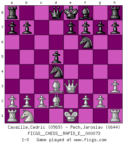 Last move : 1-0 2012 April 4 23:18:31 [Event "FICGS__CHESS__RAPID_E__000073"] [Site "FICGS"] [Date "2012.01.18"] [Round "1"] [White "Cavaille,Cedric"] [Black "Pech,Jaroslav"] [Result "1-0"] [WhiteElo "0969"] [BlackElo "0644"] 1.e4 c6 2.Nf3 d5 3.exd5 cxd5 4.d4 Nf6 5.Bd3 Nc6 6.Bd2 Bg4 7.h3 Bxf3 8.Qxf3 Nxd4 9.Qe3 1-0 This chess game has been lost on time (started : 2012.01.18 17:5:11) Caro-Kann defense Player White won this chess game. Follow this game move after move (download)Every Pawn is a potential Queen. (James Mason) Gewinnen beim Schach fördert das Selbstvertrauen. Beim Sex spüre ich sowas nicht... (Garry Kasparov) a manera como él juega al Ajedrez, demuestra la completa naturaleza de un hombre. (Stanley Ellin) Les échecs sont plus proches de l'art de l'assassinat que de l'art de la guerre. (Arturo Perez-Reverte) Dave, my mind is going. I can feel it. (HAL 9000 in 2001, a space odyssey)