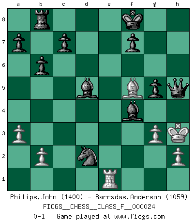 Last move : 0-1 2007 February 18 0:20:3 [Event "FICGS__CHESS__CLASS_F__000024"] [Site "FICGS"] [Date "2007.01.15"] [Round "1"] [White "Philips,John"] [Black "Barradas,Anderson"] [Result "0-1"] [WhiteElo "1400"] [BlackElo "1059"] 1.c4 Nf6 2.Nc3 e6 3.e4 d5 4.d3 Bb4 5.Nge2 dxe4 6.d4 Nc6 7.g3 b6 8.Bg2 Bb7 9.O-O O-O 10.Nxe4 Nxe4 11.a3 Bd6 12.Bxe4 Qd7 13.Be3 Rfe8 14.Qd3 Rab8 15.d5 exd5 16.cxd5 Ne5 17.Bxh7+ Kf8 18.Bf5 Qe7 19.Qd2 Nf3+ 20.Kg2 Nxd2 21.Rfe1 Bxd5+ 22.f3 Qxe3 23.Nf4 Qxf3+ 24.Kh3 Bxf4 25.Kh4 Rxe1 26.Rxe1 g5+ 27.Kh3 Qh5+ 0-1 English : Mikenas-Carls variation Kingside Castling by player White (move 9) Kingside Castling by player Black (move 9) Player Black won this chess game. Follow this game move after move (download)Chess is above all, a fight ! (Emanuel Lasker) Ich habe die besten Aussichten, den ersten Preis zu gewinnen - denn jeder muss gegen Steinitz spielen, nur ich nicht! (Wilhelm Steinitz) Yo tuve un dolor de muelas en la primer partida. En el segundo juego, tuve un dolor de cabeza. En el tercero, tuve un ataque de reumatísmo. En la cuarta partida, no me sentía muy bien. ¿Y en el quinto juego? Bueno, ¿que acaso uno tiene que ganar todos los juegos?. (Siegbert Tarrasch) Les Cavaliers se révèlent fort utiles dans les positions fermées. D'habitude, les Fous sont un peu plus forts que les Cavaliers dans les positions ouvertes. Qu'on le veuille ou non, il restera toujours des exceptions ! The worth of a book is to be measured by what you can carry away from it. (James Bryce)