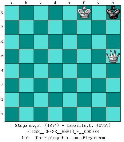 Last move : 1-0 2012 January 29 19:0:11 [Event "FICGS__CHESS__RAPID_E__000073"] [Site "FICGS"] [Date "2012.01.18"] [Round "1"] [White "Stoyanov,Zdravko"] [Black "Cavaille,Cedric"] [Result "1-0"] [WhiteElo "1274"] [BlackElo "0969"] 1.e4 c5 2.Nf3 d6 3.h3 Nf6 4.c3 e6 5.a3 Be7 6.Be2 O-O 7.d3 Nc6 8.Be3 b5 9.O-O a5 10.Nbd2 b4 11.axb4 Bb7 12.bxc5 dxc5 13.d4 cxd4 14.cxd4 Ba6 15.Bxa6 Rxa6 16.Qe2 Ra8 17.Qb5 Nb4 18.e5 Nfd5 19.Nc4 Nxe3 20.Nxe3 Nd5 21.Nxd5 Qxd5 22.Qxd5 exd5 23.Rfe1 Rfb8 24.Ra2 a4 25.Re3 Ra7 26.Ne1 h6 27.Nc2 g5 28.Na3 Kg7 29.Nb1 Kg6 30.Nc3 Rba8 31.Nb5 Ra5 32.Nc3 Bd8 33.g4 Bb6 34.Ne2 Rc8 35.e6 Re8 36.exf7 Kxf7 37.Rf3+ Kg7 38.Re3 Rxe3 39.fxe3 Kg6 40.Nc3 h5 41.Rxa4 Rxa4 42.Nxa4 Ba5 43.gxh5+ Kxh5 44.Kg2 Kh4 45.Nc5 Bd2 46.e4 dxe4 47.Nxe4 Bc1 48.b4 g4 49.hxg4 Kxg4 50.Kf2 Kf4 51.Nc3 Bd2 52.Nd5+ Ke4 53.Ke2 Kxd4 54.Kxd2 Kxd5 55.Kc3 Kc6 56.Kc4 Kb6 57.b5 Kb7 58.Kc5 Kc7 59.b6+ Kb7 60.Kb5 Ka8 61.Ka6 Kb8 62.b7 Kc7 63.Ka7 Kd7 64.b8Q Kc6 65.Qb4 Kc7 66.Qc5+ Kd7 67.Kb8 Kd8 68.Qd5+ Ke7 69.Kc8 Kf8 70.Kd7 Kg7 71.Qg5+ Kf7 72.Qf5+ Kg7 73.Ke8 Kg8 74.Qg5+ Kh7 75.Kf8 Kh8 76.Qh5+ 1-0 Sicilian Kingside Castling by player Black (move 6) Kingside Castling by player White (move 9) 10 pieces endgame at move 43 : White KNPPPP , Black KBPP WHITE : King + 1 Knight 4 Pawns BLACK : King + 1 Bishop 2 Pawns 9 pieces endgame at move 46 : White KNPPP , Black KBPP WHITE : King + 1 Knight 3 Pawns BLACK : King + 1 Bishop 2 Pawns 8 pieces endgame at move 47 : White KNPPP , Black KBP WHITE : King + 1 Knight 3 Pawns BLACK : King + 1 Bishop 1 Pawn 7 pieces endgame at move 49 : White KNPPP , Black KB WHITE : King + 1 Knight 3 Pawns BLACK : King + 1 Bishop 6 pieces endgame at move 49 : White KNPP , Black KB WHITE : King + 1 Knight 2 Pawns BLACK : King + 1 Bishop 5 pieces endgame at move 53 : White KNP , Black KB WHITE : King + 1 Knight 1 Pawn BLACK : King + 1 Bishop 4 pieces endgame at move 54 : White KNP , Black K WHITE : King + 1 Knight 1 Pawn BLACK : King + 3 pieces endgame at move 54 : White KP , Black K WHITE : King + 1 Pawn BLACK : King + Promotion Queen by player White (move 64) Player White won this chess game. Follow this game move after move (download)If your opponent offers you a draw, try to work out why he thinks he's worse off. (Nigel Short) Das Zentrum ist der Balkan des Schachbretts - Kriegshandlungen können in jedem Moment ausbrechen. (Aaron Nimzowitsch) Las combinaciones han sido siempre el aspecto más intrigante del Ajedrez. Los Maestros las buscan, el público las aplauden, los críticos las alaban. La razón se debe a que las combinaciones hacen posible que el Ajedrez sea más que un ejercicio matemático con una carencia de vida. Ellas son la poesía del juego, son del Ajedrez lo que la melodía es de la música. Ellas representan el triunfo de la mente sobre la materia. (Reuben Fine) Nous sommes les pions de la mystérieuse partie d'Echecs jouée par Dieu. Il nous déplace, nous arrête, nous pousse encore, puis nous lance un à un dans la boîte du Néant. Epitaphe sur la tombe de David Janowsky (1868-1927). After growing wildly for years, the field of computing appears to be reaching its infancy. (John Pierce)