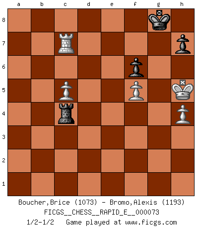 Last move : 1/2-1/2 2012 April 8 10:46:53 [Event "FICGS__CHESS__RAPID_E__000073"] [Site "FICGS"] [Date "2012.01.18"] [Round "1"] [White "Boucher,Brice"] [Black "Bromo,Alexis"] [Result "1/2-1/2"] [WhiteElo "1073"] [BlackElo "1193"] 1.f4 d5 2.Nf3 c5 3.e3 Nc6 4.Bb5 Bd7 5.Bxc6 Bxc6 6.b3 d4 7.Qe2 Nf6 8.Bb2 e6 9.O-O a6 10.d3 dxe3 11.Qxe3 Bxf3 12.Qxf3 Ra7 13.Nd2 Bd6 14.Ne4 O-O 15.f5 e5 16.Qe3 b6 17.Nxd6 Qxd6 18.Qxe5 Qxe5 19.Bxe5 Ng4 20.Bf4 f6 21.Rae1 b5 22.h3 Nh6 23.Bxh6 gxh6 24.Re6 Kf7 25.Rfe1 c4 26.Rd6 cxb3 27.axb3 a5 28.R1e6 Kg7 29.Ra6 Rxa6 30.Rxa6 Rc8 31.c4 bxc4 32.dxc4 Rb8 33.Rxa5 Rxb3 34.Ra7+ Kg8 35.Rc7 Rc3 36.Kh2 Rc2 37.Kg3 Rc3+ 38.Kf4 Rc2 39.g3 Rc3 40.h4 h5 41.g4 hxg4 42.Kxg4 Rc2 43.c5 Rc4+ 44.Kh5 1/2-1/2 Bird's Opening Kingside Castling by player White (move 9) Kingside Castling by player Black (move 14) 10 pieces endgame at move 41 : White KRPPP , Black KRPPP WHITE : King + 1 Rook 3 Pawns BLACK : King + 1 Rook 3 Pawns 9 pieces endgame at move 42 : White KRPPP , Black KRPP WHITE : King + 1 Rook 3 Pawns BLACK : King + 1 Rook 2 Pawns This chess game ended in a draw. Follow this game move after move (download)Chess is war over the board. The object is to crush the opponents mind. (Bobby Fischer) Wer mein Gambit spielt, muß bereit sein, alle Brücken hinter sich abzubrechen. Es verändert den ganzen Menschen. Es wirkt wie ein Zauberstab und fördert verkümmerte, gute Charakter- eigenschaften wieder zu Tage. (Emil Joseph Diemer) Nunca antes ha habido un jugador de Ajedrez con tal conocimiento a fondo de las complejidades del juego y una inmensa voluntad absolutamente indomable de ganar. Yo pienso que Fischer es el jugador mas grande que jamás haya existido. (Lisa Lane) On a dit que l'homme se distingue de l'animal par le fait qu'il achète plus de livres qu'il ne peut en lire. Je voudrais suggérer qu'inclure à la liste des livres quelques livres d'échecs rendrait la distinction manifeste. (Edward Lasker) A clear conscience is usually the sign of a bad memory. (Unknown)