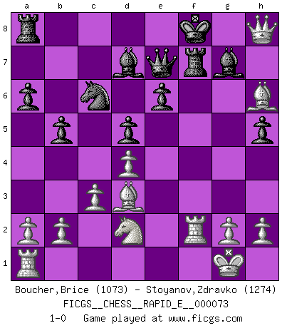 Last move : 1-0 2012 March 10 18:14:24 [Event "FICGS__CHESS__RAPID_E__000073"] [Site "FICGS"] [Date "2012.01.18"] [Round "1"] [White "Boucher,Brice"] [Black "Stoyanov,Zdravko"] [Result "1-0"] [WhiteElo "1073"] [BlackElo "1274"] 1.f4 c5 2.Nf3 Nc6 3.e3 a6 4.d4 cxd4 5.exd4 d5 6.Bd3 e6 7.c3 h6 8.Ne5 Nxe5 9.fxe5 Ne7 10.O-O Nc6 11.Qh5 Qe7 12.Be3 g6 13.Qf3 Bd7 14.Nd2 Bg7 15.Rf2 O-O 16.Qh3 h5 17.Qg3 b5 18.Bg5 f6 19.exf6 Bxf6 20.Bh6 Rf7 21.Qxg6+ Bg7 22.Qh7+ Kf8 23.Qh8+ 1-0 Bird's Opening Kingside Castling by player White (move 10) Kingside Castling by player Black (move 15) Player White won this chess game. Follow this game move after move (download)Is Bobby Fischer quite sane ? (Salo Flohr) Glücklicherweise sind Großmeister Ruben Fines reine Schachbücher weniger phallozentrisch [als seine Schachpsychologie] und deswegen auch weniger lächerlich. (Nigel Short) Yo nunca en mi vida he jugado la Defensa Francesa, que viene siendo la más aburrida de todas las Aperturas. (Wilhelm Steinitz) Shah mat. Le roi est mort. Cri de fierté d'un joueur venant de terrasser son adversaire, courtoisement, sans effusion de sang. Nowadays, anyone who cannot speak English and is incapable of using the Internet is regarded as backward. (Al-Waleed bin Talal)