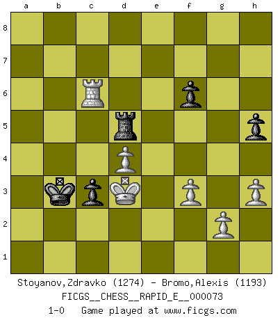 Last move : 1-0 2012 January 26 18:31:36 [Event "FICGS__CHESS__RAPID_E__000073"] [Site "FICGS"] [Date "2012.01.18"] [Round "1"] [White "Stoyanov,Zdravko"] [Black "Bromo,Alexis"] [Result "1-0"] [WhiteElo "1274"] [BlackElo "1193"] 1.e4 e5 2.Nf3 Nc6 3.Bb5 d6 4.h3 Bd7 5.d3 a6 6.Bxc6 Bxc6 7.O-O Nf6 8.Bg5 Be7 9.Bxf6 Bxf6 10.Re1 Qd7 11.Nc3 O-O-O 12.Qd2 b5 13.b4 Rhe8 14.d4 exd4 15.Nxd4 Bxd4 16.Qxd4 f6 17.Nd5 Bxd5 18.Qxd5 c6 19.Qd2 h6 20.Rad1 Qe6 21.f3 Qxa2 22.Qc3 Kc7 23.Kf2 Qc4 24.Qxc4 bxc4 25.c3 d5 26.exd5 Rxe1 27.Rxe1 cxd5 28.Re7+ Rd7 29.Re6 Kb7 30.Ke3 d4+ 31.cxd4 Rd5 32.Re7+ Kc6 33.Rxg7 h5 34.Rg8 Kb5 35.Rb8+ Ka4 36.Ra8 Kxb4 37.Rxa6 Kb3 38.Rc6 c3 39.Kd3 1-0 Ruy Lopez : Old Steinitz defense Kingside Castling by player White (move 7) Queenside Castling by player Black (move 11) Player White won this chess game. Follow this game move after move (download)When the Chess game is over, the Pawn and the King go back to the same box. (Irish saying) Ja, jede Frau in Holland liebt mich bestimmt, und alle Männer hassen mich. (Loek van Wely) El Ajedrez es realmente noventa y nueve por ciento calculación. (Soltis) La conception d'un plan est le processus par lequel un joueur exploite les avantages de sa position tout en s'efforçant d'en réduire au minimum les inconvénients. Afin de garantir le succès, un plan doit toujours se fonder sur un diagnostic objectif des particularités d'une position. La conception d'un plan est d'autant plus difficile que la position est équilibrée, et grandement facilitée lorsqu'il n'existe qu'un seul plan susceptible de répondre aux exigences de la position. (Harry Golombek) The real danger is not that computers will begin to think like men, but that men will begin to think like computers. (Sydney J. Harris)