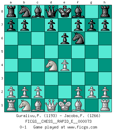 Last move : 0-1 2012 January 23 12:41:7 [Event "FICGS__CHESS__RAPID_E__000073"] [Site "FICGS"] [Date "2012.01.18"] [Round "1"] [White "Guralivu,Paul-Iosif"] [Black "Jacobs,Francois"] [Result "0-1"] [WhiteElo "1193"] [BlackElo "1266"] 1.e4 c5 2.Nf3 e6 3.d4 cxd4 4.Nxd4 Nf6 0-1 Sicilian : Anderssen variation Player Black won this chess game. Follow this game move after move (download)Whoever sees no other aim in the game than that of giving checkmate to one's opponent will never become a good Chess player. (Euwe) Ich liebe den Moment, wenn ich das Ego meines Gegenüber breche. (Robert James Fischer) El juego de Fischer siempre fue nítido, racional y brillante. Uno de los mejores por siempre. (Dave Regis) Il s'avisa de me proposer d'apprendre les échecs qu'il jouait un peu... me voilà forcené des échecs. J'achète un échiquier, je m'enferme dans ma chambre, j'y passe des jours et des nuits à vouloir apprendre par cur toutes les parties. (Jean-Jacques Rousseau, Confessions) SEO proverb : Make your website optimized for human beings, not for search engines.