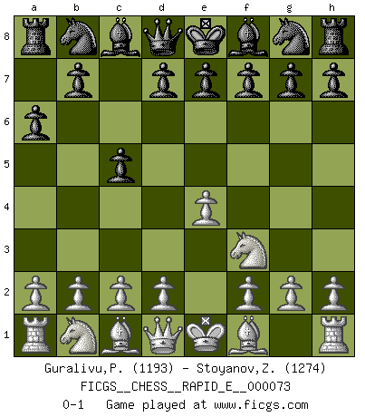 Last move : 0-1 2012 January 23 12:41:5 [Event "FICGS__CHESS__RAPID_E__000073"] [Site "FICGS"] [Date "2012.01.18"] [Round "1"] [White "Guralivu,Paul-Iosif"] [Black "Stoyanov,Zdravko"] [Result "0-1"] [WhiteElo "1193"] [BlackElo "1274"] 1.e4 c5 2.Nf3 a6 0-1 Sicilian : O'Kelly variation Player Black won this chess game. Follow this game move after move (download)Nonsense was the last thing Fischer was interested in, as far as Chess was concerned. (Elie Agur) Dein Körper muss in Topform sein. Dein Schach verfällt, wenn dein Körper verfällt. Der Körper kann nicht vom Geist getrennt werden. (Robert James Fischer) La belleza de un movimiento no se refleja solo en su apariencia, sino en el pensamiento detrás de él. (Siegbert Tarrasch) Un journaliste : 'Vous préférez avoir une dame de plus sur l'échiquier ou au lit ?' Boris Spassky : 'Ca dépend de la position.' If things go wrong, don't go with them. (Roger Babson)