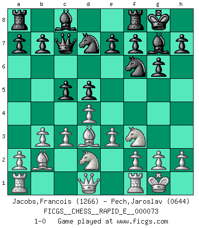 Last move : 1-0 2012 April 5 23:21:1 [Event "FICGS__CHESS__RAPID_E__000073"] [Site "FICGS"] [Date "2012.01.18"] [Round "1"] [White "Jacobs,Francois"] [Black "Pech,Jaroslav"] [Result "1-0"] [WhiteElo "1266"] [BlackElo "0644"] 1.d4 Nf6 2.Nf3 g6 3.e3 c5 4.c3 Bg7 5.Bd3 Qc7 6.O-O O-O 7.Nbd2 d5 8.b3 Nbd7 9.Bb2 1-0 This chess game has been lost on time (started : 2012.01.18 17:5:11) King's Indian : East Indian defense Kingside Castling by player White (move 6) Kingside Castling by player Black (move 6) Player White won this chess game. Follow this game move after move (download)There are tough players and nice guys, and I'm a tough player. (Bobby Fischer) Ein Buch ist ein Spiegel; wenn ein Affe hineinsieht, so kann kein Apostel heraus gucken. (Georg Christoph Lichtenberg) Un Peón pasado aumenta su poder a medida de que el número de piezas en el tablero disminuye. (Capablanca) Les échecs, c'est la lutte contre l'erreur. (Johannes Zukertort) If you ain't just a little scared when you enter a casino, you are either very rich or you haven't studied the games enough. (Pappy)