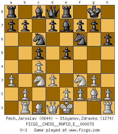 Last move : 0-1 2012 April 3 11:1:7 [Event "FICGS__CHESS__RAPID_E__000073"] [Site "FICGS"] [Date "2012.01.18"] [Round "1"] [White "Pech,Jaroslav"] [Black "Stoyanov,Zdravko"] [Result "0-1"] [WhiteElo "0644"] [BlackElo "1274"] 1.c4 c5 2.Nf3 Nc6 3.Nc3 e5 4.g3 h6 5.Bg2 Be7 6.d3 Nf6 7.a3 O-O 8.Rb1 Re8 0-1 This chess game has been lost on time (started : 2012.01.18 17:5:11) English : Symmetrical variation Kingside Castling by player Black (move 7) Player Black won this chess game. Follow this game move after move (download)Bobby Fischer is the greatest Chess genius of all time ! (Alexander Kotov) Es ist besser die Steine des Gegners zu opfern. (Savielly Grigorievitsch Tartakower) Me siento como si fuera una pieza en una partida de Ajedrez, cuando mi oponente me indica: esa pieza no puede ser movida. (Soren Kierkegaard) Le génie consiste à savoir transgresser les règles au moment opportun. (Teichmann) Gambling is the son of avarice and the father of despair. (French proverb)