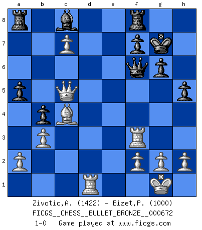 Last move : 1-0 2012 January 20 17:15:37 [Event "FICGS__CHESS__BULLET_BRONZE__000672"] [Site "FICGS"] [Date "2012.01.20"] [Round "1"] [White "Zivotic,Aleksandar"] [Black "Bizet,Patrick"] [Result "1-0"] [WhiteElo "1422"] [BlackElo "1000"] 1.e4 c5 2.Nf3 e6 3.Nc3 Nc6 4.d3 d5 5.exd5 exd5 6.d4 Nf6 7.Bg5 cxd4 8.Nxd4 Be7 9.Be2 O-O 10.O-O a6 11.Re1 Qc7 12.Bxf6 Bxf6 13.Nxd5 Qd6 14.Nxc6 Qxc6 15.Bf3 Qd6 16.Nxf6+ Qxf6 17.b3 Rb8 18.c4 b5 19.c5 b4 20.c6 Rb6 21.Qd2 a5 22.Qd5 Ra6 23.Qc5 Rd8 24.c7 Rf8 25.Rad1 g6 26.Re3 h5 27.Bd5 Kg7 28.Bc4 Ra8 29.Rf3 1-0 Sicilian defense Kingside Castling by player Black (move 9) Kingside Castling by player White (move 10) Player White won this chess game. Follow this game move after move (download)The older I grow, the more I value pawns. (Paul Keres) Ich verstehe mehr vom Schach als irgendein anderer lebender Meister. (José Raúl Capablanca) ¿Esta Bobby Fischer algo cuerdo?. (Salo Flohr) Même si l'adversaire joue le coup analysé précédemment, recommencez l'analyse en voyant la nouvelle position. Première règle de Blumenfeld Some people are so afraid to die that they never begin to live. (Henry Van Dyke)