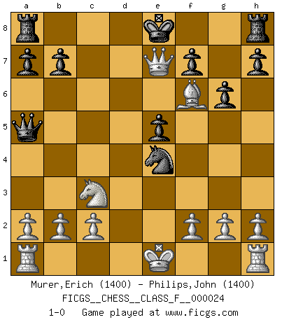 Last move : 1-0 2007 April 7 4:13:48 [Event "FICGS__CHESS__CLASS_F__000024"] [Site "FICGS"] [Date "2007.01.15"] [Round "1"] [White "Murer,Erich"] [Black "Philips,John"] [Result "1-0"] [WhiteElo "1400"] [BlackElo "1400"] 1.e4 c5 2.Nf3 d6 3.d4 cxd4 4.Nxd4 e5 5.Bb5+ Bd7 6.Bxd7+ Nxd7 7.Nf5 g6 8.Nxd6+ Bxd6 9.Qxd6 Ngf6 10.Nc3 Qa5 11.Bg5 Nc5 12.Bxf6 Nxe4 13.Qe7+ 1-0 Sicilian Player White won this chess game. Follow this game move after move (download)We don't really know how the game was invented, though there are suspicions. As soon as we discover the culprits, we'll let you know. (Bruce Pandolfini) Ich spiele 70 Eröffnungssysteme. (Viktor Kortschnoi) Fischer no está bajo la obligación de nadie. (Joseph Platz) Un millionnaire : 'Monsieur Steinitz ! Vous ne participez aux tournois que pour l'argent, alors que moi je n'y viens que pour l'honneur.' Steinitz : 'Chacun joue pour ce qu'il n'a pas'... A good programmer is someone who always looks both ways before crossing a one-way street. (Doug Linder)