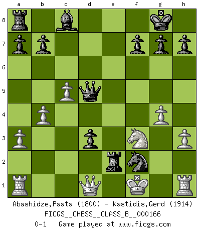 Last move : 0-1 2012 February 26 21:4:9 [Event "FICGS__CHESS__CLASS_B__000166"] [Site "FICGS"] [Date "2012.01.21"] [Round "1"] [White "Abashidze,Paata"] [Black "Kastidis,Gerd"] [Result "0-1"] [WhiteElo "1800"] [BlackElo "1914"] 1.d4 Nf6 2.h3 e6 3.a3 d5 4.Bf4 c5 5.dxc5 Bxc5 6.e3 O-O 7.b4 Bd6 8.Bxd6 Qxd6 9.c3 Nc6 10.Nf3 e5 11.c4 d4 12.c5 Qd5 13.exd4 Nxd4 14.Nxd4 exd4 15.Nd2 Re8+ 16.Be2 d3 17.Nf3 Rxe2+ 18.Kf1 Ne4 19.g4 Nxf2 0-1 Queen's pawn game Kingside Castling by player Black (move 6) Player Black won this chess game. Follow this game move after move (download)I believe that Chess possesses a magic that is also a help in advanced age. A rheumatic knee is forgotten during a game of Chess and other events can seem quite unimportant in comparison with a catastrophe on the chessboard. (Vlastimil Hort) Frage: Wie viele Autos haben Sie schon zerstört? - Antwort: Nur zwei. (Loek van Wely) Repentinamente, me resultaba obvio en mi analisis que yo había pasado por alto lo que Fischer había visto en el tablero con la mas grande facilidad. (Mikhail Botvinnik) Un journaliste : 'Vous préférez avoir une dame de plus sur l'échiquier ou au lit ?' Boris Spassky : 'Ca dépend de la position.' All the biggest technological inventions created by man - the airplane, the automobile, the computer - says little about his intelligence, but speaks volumes about his laziness. (Mark Kennedy)
