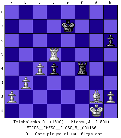 Last move : 1-0 2012 February 14 19:9:32 [Event "FICGS__CHESS__CLASS_B__000166"] [Site "FICGS"] [Date "2012.01.21"] [Round "1"] [White "Tsimbalenko,Dmitry"] [Black "Michow,Jordan"] [Result "1-0"] [WhiteElo "1800"] [BlackElo "1800"] 1.d4 e6 2.Nf3 d5 3.g3 h6 4.Bg2 Nf6 5.Nbd2 Nc6 6.c3 Be7 7.Ne5 Nxe5 8.dxe5 Ng4 9.Nf3 f6 10.Qa4+ c6 11.Qxg4 Bf8 12.Qg6+ Kd7 13.e4 Qe8 14.Qxe8+ Kxe8 15.exd5 cxd5 16.exf6 gxf6 17.Be3 b6 18.O-O Bc5 19.Bxc5 bxc5 20.b3 Ba6 21.Rfe1 Kf7 22.Rad1 Bb7 23.c4 d4 24.Ne5+ fxe5 25.Bxb7 Rab8 26.Bg2 Kf6 27.Re4 Rhg8 28.Rde1 Rg5 29.f4 exf4 30.Rxe6+ Kg7 31.gxf4 Rf5 32.Re7+ Kf8 33.Rxa7 Rxf4 34.Rc7 Re8 35.Rxe8+ Kxe8 36.Rxc5 Ke7 37.Rd5 1-0 Queen's pawn Kingside Castling by player White (move 18) Player White won this chess game. Follow this game move after move (download)A good player is always lucky. (Jose Raul Capablanca) Drei Punkte vor allen anderen ist wie einer, der im weißen Anzug posiert, während der Rest in Müllsäcke gekleidet dasteht. (Viktor Kortschnoi) La enorme capacidad mental, en la que sin ella no puede un jugador de Ajedrez existir, es demasiado requerida por el Ajedrez al grado de que nunca podrá liberar su mente de este juego. (Albert Einstein) Il n'y a pas de prix trop élevé au scalp de l'ennemi. (Koblentz) Art disturbs, science reassures. (Georges Braque, Le Jour et la Nuit)