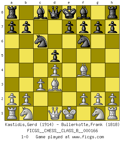 Last move : 1-0 2012 March 15 8:41:36 [Event "FICGS__CHESS__CLASS_B__000166"] [Site "FICGS"] [Date "2012.01.21"] [Round "1"] [White "Kastidis,Gerd"] [Black "Bullerkotte,Frank"] [Result "1-0"] [WhiteElo "1914"] [BlackElo "1818"] 1.e4 c6 2.d4 d5 3.exd5 cxd5 4.Bd3 Nc6 5.c3 Nf6 6.Bf4 1-0 This chess game has been lost on time (started : 2012.01.21 16:35:49) Caro-Kann : Exchange, Rubinstein variation Player White won this chess game. Follow this game move after move (download)Chess is a more highly symbolic game, but the aggressions are therefore even more frankly represented in the play. It probably began as a war game; that is, the representation of a miniature battle between the forces of two kingdoms. (Karl Meninger) Kostenjuk hat keinen Sexappeal. (Loek van Wely) El juego del Ajedrez no es solamente una diversión quieta; algunas cualidades muy valuables de la mente se pueden adquirir y cultivar con el, como convertirlos en habitos disponibles para toda ocasión; ya que la vida es algo así como el Ajedrez. (Benjamin Franklin) On croit qu'il y a plus de mauvais joueurs que de bons joueurs, c'est faux : Il y a autant de joueurs qui gagnent que de joueurs qui perdent. (Philippe Geluck) Either move or be moved. (Ezra Pound)
