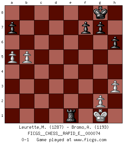 Last move : 0-1 2012 February 19 15:35:47 [Event "FICGS__CHESS__RAPID_E__000074"] [Site "FICGS"] [Date "2012.01.23"] [Round "1"] [White "Leurette,Marc-Antoine"] [Black "Bromo,Alexis"] [Result "0-1"] [WhiteElo "1287"] [BlackElo "1193"] 1.e4 e5 2.Nf3 Nc6 3.Bc4 h6 4.d4 d6 5.d5 Na5 6.Bb5+ c6 7.dxc6 bxc6 8.Ba4 Nf6 9.Nc3 Ba6 10.b4 Nc4 11.Bxc6+ Nd7 12.Bxa8 Qxa8 13.O-O Nf6 14.b5 Bb7 15.Re1 Nxe4 16.Nxe4 Bxe4 17.Qe2 d5 18.a4 Bd6 19.c3 Bxf3 20.Qxf3 e4 21.Qg4 Be5 22.Qg3 Bxg3 23.fxg3 O-O 24.Re2 Re8 25.Bb2 e3 26.Rae1 Nxb2 27.Rxb2 Qb7 28.Rbe2 Qb6 29.g4 d4 30.cxd4 Qxd4 31.a5 Qxg4 32.h3 Qb4 33.Rxe3 Qxe1+ 34.Rxe1 Rxe1+ 0-1 King's pawn game Kingside Castling by player White (move 13) Kingside Castling by player Black (move 23) Player Black won this chess game. Follow this game move after move (download)Though most people love to look at the games of the great attacking masters, some of the most successful players in history have been the quiet positional players. They slowly grind you down by taking away your space, tying up your pieces, and leaving you with virtually nothing to do ! (Yasser Seirawan) Kein Schachspieler kann gut schlafen. (H. G. Wells) No hay precio que no valga la pena por la cabellera del Rey enemigo. (Koblentz) Aux échecs, l'amour-propre est satisfait quand on remporte la victoire, mais il n'y a pas de honte à être battu. (Benjamin Franklin) Every vice is only an exaggeration of a necessary and virtuous function. (Ralph Waldo Emerson, Journals 1936)