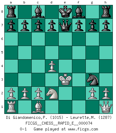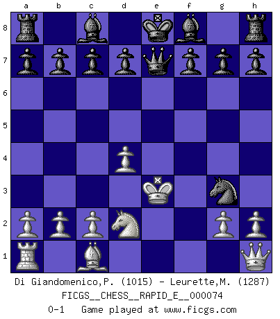 Last move : 0-1 2012 February 1 19:52:49 [Event "FICGS__CHESS__RAPID_E__000074"] [Site "FICGS"] [Date "2012.01.23"] [Round "1"] [White "Di Giandomenico,Pierino"] [Black "Leurette,Marc-Antoine"] [Result "0-1"] [WhiteElo "1015"] [BlackElo "1287"] 1.e4 e5 2.Nf3 Nc6 3.Nxe5 Nxe5 4.d4 Nf6 5.Bd3 Nxd3+ 6.Kd2 Nxf2 7.Qf1 Nxh1 8.Qxh1 Nxe4+ 9.Ke3 Qe7 10.Nd2 Ng3 0-1 Irish (Chicago) gambit Player Black won this chess game. Follow this game move after move (download)We like to think. (Gary Kasparov) Auf Remis zu spielen ist gewissermaßen ein Verbrechen gegen das Schachspiel. (Mikhail Nekhemyevich Tal) Aquel que ve no otra dirección en el juego que la de dar Jaque Mate a su oponente, nunca será un buen jugador de Ajedrez. (Euwe) Horreur, mais aussi harmonie suprême : qu'y avait-il en effet au monde en dehors des échecs ? Le brouillard, l'inconnu, le non-être... (Vladimir Nabokov) Rules and bones are meant to be broken. (Anonymous)