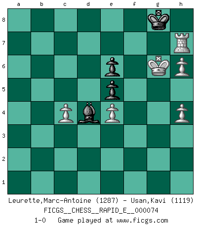 Last move : 1-0 2012 March 5 18:39:57 [Event "FICGS__CHESS__RAPID_E__000074"] [Site "FICGS"] [Date "2012.01.23"] [Round "1"] [White "Leurette,Marc-Antoine"] [Black "Usan,Kavi"] [Result "1-0"] [WhiteElo "1287"] [BlackElo "1119"] 1.e4 c5 2.Nc3 d6 3.Bb5+ Bd7 4.Bxd7+ Nxd7 5.Nf3 Ngf6 6.d3 g6 7.O-O Ne5 8.Nxe5 dxe5 9.Bg5 Bg7 10.Bxf6 Bxf6 11.b3 O-O 12.Qf3 Bg7 13.Rad1 Qa5 14.Nd5 Qxa2 15.Rc1 a5 16.Nc3 Qb2 17.Na4 Qd4 18.c3 Qd6 19.c4 b6 20.Qe3 Rab8 21.g3 b5 22.cxb5 Rxb5 23.Rb1 Rfb8 24.Nc3 Rxb3 25.Rxb3 Rxb3 26.Rc1 a4 27.Rb1 Rxc3 28.Rd1 a3 29.Qd2 Qd4 30.Kg2 e6 31.f3 Bf8 32.g4 Qb4 33.Kg3 c4 34.Rc1 Qb2 35.Qxc3 Qe2 36.dxc4 a2 37.Re1 Bb4 38.Rxe2 Bxc3 39.Rxa2 Bd4 40.h4 Kf8 41.Rc2 Ke7 42.g5 Kd6 43.Kg4 Kc6 44.Ra2 Kd7 45.Ra8 Ke7 46.Rh8 h5+ 47.gxh6 f5+ 48.Kg5 fxe4 49.fxe4 Kf7 50.Rh7+ Kg8 51.Kxg6 1-0 Sicilian : Closed Kingside Castling by player White (move 7) Kingside Castling by player Black (move 11) 10 pieces endgame at move 51 : White KRPPPP , Black KBPP WHITE : King + 1 Rook 4 Pawns BLACK : King + 1 Bishop 2 Pawns Player White won this chess game. Follow this game move after move (download)I prefer to lose a really good game than to win a bad one. (David Levy) Charakterschwächen offenbaren sich normalerweise während einer Schachpartie. (Garry Kasparov) Cuando tu casa esta en llamas, no puedes ser molestado por tus vecinos. O, como decinos en Ajedrez, si tu Rey esta bajo ataque, no te preocupa perder un Peón del lado de la Reina. (Gary Kasparov) Nous vivons dans un monde échiquéen : chaque jour qui passe est un défi à relever. (Philosophe Sasha) When I took office, only high energy physicists had ever heard of what is called the World Wide Web... Now even my cat has its own page. (Bill Clinton, 1996)