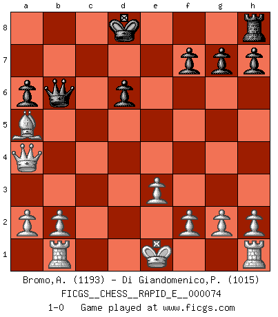 Last move : 1-0 2012 February 6 19:45:49 [Event "FICGS__CHESS__RAPID_E__000074"] [Site "FICGS"] [Date "2012.01.23"] [Round "1"] [White "Bromo,Alexis"] [Black "Di Giandomenico,Pierino"] [Result "1-0"] [WhiteElo "1193"] [BlackElo "1015"] 1.d4 d5 2.c4 dxc4 3.Nc3 Nc6 4.e3 Be6 5.Nf3 Bd5 6.Be2 Nf6 7.Nxd5 Nxd5 8.Bxc4 e6 9.Bd2 Rb8 10.Bb5 a6 11.Bxc6+ bxc6 12.Rb1 Rb5 13.Ne5 Qf6 14.Nxc6 Rb6 15.Qa4 e5 16.Nb4 Kd8 17.Nxd5 Qd6 18.Nxb6 Qxb6 19.dxe5 Bd6 20.exd6 cxd6 21.Ba5 1-0 Queen's gambit accepted Player White won this chess game. Follow this game move after move (download)The tactician knows what to do when there is something to do; whereas the strategian knows what to do when there is nothing to do. (Gerald Abrahams) Im Reiche der Wirklichkeit ist man nie so glücklich wie im Reiche der Gedanken. (Arthur Schopenhauer) Siempre es mejor sacrificar los hombres de tu oponente. (Savielly Tartakower) Le thème de l'attaque double intervient d'une manière ou d'une autre dans l'immense majorité des combinaisons. (Youri Averbakh) When it is a question of money, everybody is of the same religion. (Voltaire)