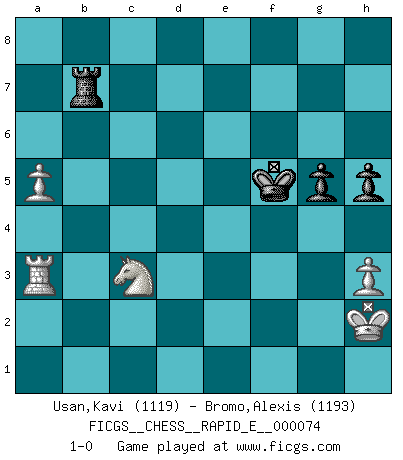 Last move : 1-0 2012 January 26 17:17:21 [Event "FICGS__CHESS__RAPID_E__000074"] [Site "FICGS"] [Date "2012.01.23"] [Round "1"] [White "Usan,Kavi"] [Black "Bromo,Alexis"] [Result "1-0"] [WhiteElo "1119"] [BlackElo "1193"] 1.e4 e5 2.Nf3 Nc6 3.Bb5 d6 4.O-O Bd7 5.c3 Nf6 6.d4 g6 7.Bxc6 Bxc6 8.dxe5 dxe5 9.Qxd8+ Rxd8 10.Nxe5 Bxe4 11.Re1 Be7 12.Bg5 O-O 13.Na3 Nd5 14.Bxe7 Nxe7 15.Rxe4 Rfe8 16.Ng4 f5 17.Nf6+ Kf7 18.Nxe8 fxe4 19.Nxc7 Nf5 20.h3 a6 21.c4 e3 22.fxe3 Nxe3 23.Re1 Nxg2 24.Kxg2 Rd2+ 25.Kg3 Rxb2 26.Ra1 Rd2 27.Kh4 h6 28.Nd5 Rd4+ 29.Kg3 Rd3+ 30.Kg2 Rxa3 31.Rf1+ Kg7 32.Rf2 b5 33.c5 Rd3 34.Nb4 Rd4 35.a3 a5 36.Nc6 Rc4 37.Nxa5 Rxc5 38.Rb2 Rg5+ 39.Kh2 Rd5 40.Rb3 h5 41.Nc6 Kh6 42.Na7 Rd7 43.Nxb5 Rb7 44.a4 g5 45.Ra3 Kg6 46.Nc3 Kf5 47.a5 1-0 Ruy Lopez : Old Steinitz defense Kingside Castling by player White (move 4) Kingside Castling by player Black (move 12) 10 pieces endgame at move 37 : White KRNPP , Black KRPPP WHITE : King + 1 Rook 1 Knight 2 Pawns BLACK : King + 1 Rook 3 Pawns 9 pieces endgame at move 43 : White KRNPP , Black KRPP WHITE : King + 1 Rook 1 Knight 2 Pawns BLACK : King + 1 Rook 2 Pawns Player White won this chess game. Follow this game move after move (download)The game of Chess is not merely an idle amusement; several very valuable qualities of the mind are to be acquired and strengthened by it, so as to become habits ready on all occasions; for life is a kind of Chess. (Benjamin Franklin) Obwohl ich vom Stil her kaum zu den Priestern der Schachkunst gezählt werde, halte ich Schach doch für eine Kunst. (Tigran Petrosjan) Aquellos que dicen entender al Ajedrez, no entienden nada. (Robert Hubner) Des idées, des idées, j'en ai cent, j'en ai mille. Des bonnes, des mauvaises, applicables, irréalisables... Il suffit de faire le tri ! (Roos) Happy endings are just stories that haven't finished yet. (Jane Smith in Mr & Mrs Smith)