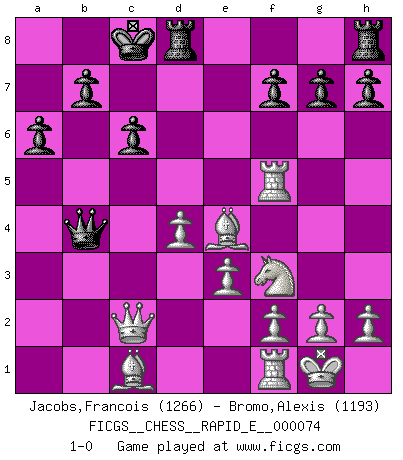 Last move : 1-0 2012 January 26 17:1:7 [Event "FICGS__CHESS__RAPID_E__000074"] [Site "FICGS"] [Date "2012.01.23"] [Round "1"] [White "Jacobs,Francois"] [Black "Bromo,Alexis"] [Result "1-0"] [WhiteElo "1266"] [BlackElo "1193"] 1.d4 d5 2.Nf3 Nc6 3.c4 e6 4.Nc3 Nf6 5.a3 a6 6.cxd5 exd5 7.e3 Bg4 8.Be2 Bd6 9.b4 Ne4 10.Nxd5 Bxb4+ 11.Nxb4 Nxb4 12.axb4 c6 13.Qc2 Bf5 14.Bd3 Qd5 15.O-O O-O-O 16.Ra5 Qd6 17.Rxf5 Qxb4 18.Bxe4 1-0 Queen's pawn game, Chigorin variation Kingside Castling by player White (move 15) Queenside Castling by player Black (move 15) Player White won this chess game. Follow this game move after move (download)Every Pawn is a potential Queen. (James Mason) Die Fehler sind da, Sie warten nur darauf gemacht zu werden. (Savielly Grigorievitsch Tartakower) El Ajedrez es parte de la cultura, y si una cultura esta en decadencia, entonces también el Ajedrez declinará. (Mikhail Botvinnik) C'est la seule position que je connaisse où les deux camps sont mals. Propos prêtés à V. Anand. History is the quarrels of popes and kings, with wars or pestilences in every page; the men all so good for nothing, and hardly any women at all. (Jane Austen)