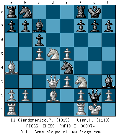 Last move : 0-1 2012 January 31 17:6:8 [Event "FICGS__CHESS__RAPID_E__000074"] [Site "FICGS"] [Date "2012.01.23"] [Round "1"] [White "Di Giandomenico,Pierino"] [Black "Usan,Kavi"] [Result "0-1"] [WhiteElo "1015"] [BlackElo "1119"] 1.d4 d5 2.e3 e6 3.Nf3 Nf6 4.Bd3 Bd6 5.Bb5+ Bd7 6.Qd3 Ne4 7.O-O O-O 8.Bd2 c6 9.Ba4 Qf6 10.c4 Qg6 11.c5 Bc7 12.Nc3 e5 13.dxe5 Bh3 14.Nxd5 Qxg2+ 0-1 Queen's pawn game Kingside Castling by player White (move 7) Kingside Castling by player Black (move 7) Player Black won this chess game. Follow this game move after move (download)Chess is thirty to forty percent psychology. You don't have this when you play a computer. I can't confuse it. (Judith Polgar) Ich kämpfe solange mein Gegner einen Fehler machen kann. (Emanuel Lasker) El ganar no lo es todo... pero el perder es nada. (Mednis) Pour moi, les échecs ne sont pas un jeu mais un art. (Alexandre Alekhine) Difficult things take a long time, impossible things a little longer. (Author unknown)