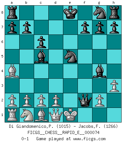 Last move : 0-1 2012 January 31 9:40:55 [Event "FICGS__CHESS__RAPID_E__000074"] [Site "FICGS"] [Date "2012.01.23"] [Round "1"] [White "Di Giandomenico,Pierino"] [Black "Jacobs,Francois"] [Result "0-1"] [WhiteElo "1015"] [BlackElo "1266"] 1.e4 e5 2.Nf3 Nc6 3.Nxe5 Nxe5 4.f4 Nc6 5.Bd3 Bc5 6.Rf1 d6 7.e5 dxe5 8.fxe5 Nxe5 9.Bb5+ c6 10.Ba4 Bg4 11.h3 Qh4+ 12.Rf2 Qxf2+ 0-1 King's pawn game Player Black won this chess game. Follow this game move after move (download)Of Chess it has been said that life is not long enough for it, but that is the fault of life, not Chess. (William Ewart Napier) Verschiedene, sehr schätzbare und im Laufe des Lebens nützliche Eigenschaften des Geistes können durch das Schachspiel erworben und gekräftigt werden, so dass sie zu Gewohnheiten werden, die uns nie im Stich lassen. (Benjamin Franklin) Vive, pierde y aprende al observar a tu oponente como ganar. (Amber Steenbock) On n'a jamais que l'âge auquel on a commence à jouer aux échecs car après on cesse de vieillir. (Capablanca) Real knowledge is to know the extent of one's ignorance. (Confucius)