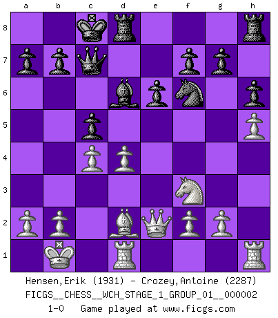 Last move : 1-0 2007 March 7 0:45:53 [Event "FICGS__CHESS__WCH_STAGE_1_GROUP_01__000002"] [Site "FICGS"] [Date "2007.01.16"] [Round "1"] [White "Hensen,Erik"] [Black "Crozey,Antoine"] [Result "1-0"] [WhiteElo "1931"] [BlackElo "2287"] 1.e4 c6 2.d4 d5 3.Nc3 dxe4 4.Nxe4 Bf5 5.Ng3 Bg6 6.h4 h6 7.Nf3 Nd7 8.h5 Bh7 9.Bd3 Bxd3 10.Qxd3 e6 11.Bf4 Qa5+ 12.Bd2 Qc7 13.O-O-O O-O-O 14.Kb1 Ngf6 15.c4 c5 16.Qe2 Bd6 17.Ne4 Nxe4 18.Qxe4 Nf6 19.Qe2 1-0 This chess game has been lost on time (started : 2007.01.16 13:56:58) Caro-Kann : Classical, 7...Nd7 Queenside Castling by player White (move 13) Queenside Castling by player Black (move 13) Player White won this chess game. Follow this game move after move (download)The laws of Chess do not permit a free choice: you have to move whether you like it or not. (Emanuel Lasker) Schach sollte überall auf der Welt Schulfach werden. Es fördert die geistige Auseinandersetzung. Es lehrt die Demut in der Niederlage. (Garry Kasparov) No puedes jugar al Ajedrez si eres de corazón noble. (Proverbio Francés) Plusieurs personnes se sont demandées comment Tal faisait pour gagner... En fait, c'est très simple ! Il met ses pièces au centre de l'échiquier et les sacrifie quelque part ! (David Bronstein) Every man's memory is his private literature. (Aldous Huxley)