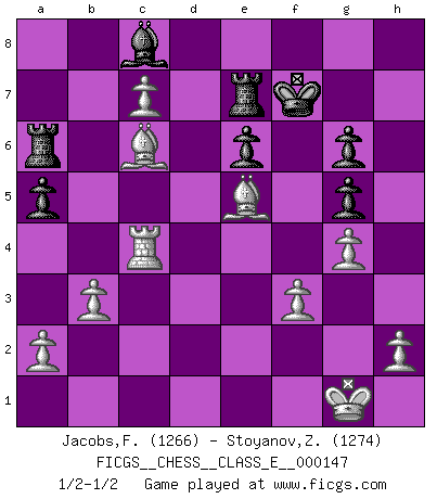 Last move : 1/2-1/2 2012 January 31 18:16:16 [Event "FICGS__CHESS__CLASS_E__000147"] [Site "FICGS"] [Date "2012.01.24"] [Round "1"] [White "Jacobs,Francois"] [Black "Stoyanov,Zdravko"] [Result "1/2-1/2"] [WhiteElo "1266"] [BlackElo "1274"] 1.d4 d5 2.Nf3 Nc6 3.e3 a6 4.c3 e6 5.Bd3 Bd6 6.O-O Nf6 7.Nbd2 h6 8.Re1 O-O 9.e4 dxe4 10.Nxe4 Nxe4 11.Bxe4 Na5 12.b3 Bd7 13.Bb2 c6 14.Rc1 Re8 15.Bb1 b5 16.Qd3 f5 17.Ne5 Nb7 18.Qf3 Bxe5 19.Rxe5 Nd6 20.c4 Nf7 21.Re2 Ng5 22.Qg3 bxc4 23.Rxc4 Ne4 24.Rxe4 fxe4 25.d5 Qg5 26.Qxg5 hxg5 27.dxc6 Bc8 28.Bxe4 a5 29.c7 Ra6 30.Bc6 Re7 31.Be5 Kf7 32.g4 g6 33.f3 Rb6 34.Bc3 Ra6 35.Be5 Rb6 36.Bc3 Ra6 37.Be5 1/2-1/2 Queen's pawn game, Chigorin variation Kingside Castling by player White (move 6) Kingside Castling by player Black (move 8) This chess game ended in a draw. Follow this game move after move (download)Morphy was probably the greatest genius of them all. (Bobby Fischer) Schach verlangt totale Konzentration. (Robert James Fischer) Siempre es mejor sacrificar los hombres de tu oponente. (Savielly Tartakower) Je menace de comprendre la position. (Anonyme) If everyone is thinking alike, then somebody isn't thinking. (US General George S. Patton)