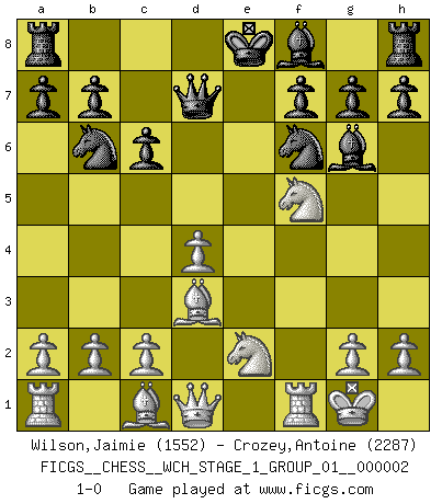 Last move : 1-0 2007 March 1 6:11:19 [Event "FICGS__CHESS__WCH_STAGE_1_GROUP_01__000002"] [Site "FICGS"] [Date "2007.01.16"] [Round "1"] [White "Wilson,Jaimie"] [Black "Crozey,Antoine"] [Result "1-0"] [WhiteElo "1552"] [BlackElo "2287"] 1.e4 c6 2.d4 d5 3.Nc3 dxe4 4.Nxe4 Bf5 5.Ng3 Bg6 6.Bc4 e6 7.N1e2 Nf6 8.O-O Nbd7 9.f4 Nb6 10.Bd3 Qd7 11.f5 exf5 12.Nxf5 1-0 This chess game has been lost on time (started : 2007.01.16 13:56:58) Caro-Kann : Classical variation Kingside Castling by player White (move 8) Player White won this chess game. Follow this game move after move (download)The isolated Pawn casts gloom over the entire chessboard. (Aaron Nimzovich) Du kannst im Schach nur gut werden, wenn du das Spiel liebst. (Robert James Fischer) Fischer era un maestro de claridad y un Rey del posicionamiento astuto. Sus oponentes podían ver hacia donde se dirigía pero eran impotentes para detenerlo. (Bruce Pandolfini) Horreur, mais aussi harmonie suprême : qu'y avait-il en effet au monde en dehors des échecs ? Le brouillard, l'inconnu, le non-être... (Vladimir Nabokov) It is the aim of the modern school, not to treat every position according to one general law, but according to the principle inherent in the position. (Richard Reti)