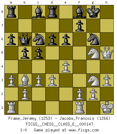 Last move : 1-0 2012 February 1 12:46:28 [Event "FICGS__CHESS__CLASS_E__000147"] [Site "FICGS"] [Date "2012.01.24"] [Round "1"] [White "Frame,Jeremy"] [Black "Jacobs,Francois"] [Result "1-0"] [WhiteElo "1253"] [BlackElo "1266"] 1.e4 c5 2.Bc4 e6 3.Nc3 Nc6 4.Nf3 a6 5.a3 d6 6.d3 Be7 7.h3 Nf6 8.Bf4 O-O 9.O-O b5 10.Bb3 Nd7 11.Qd2 Qb6 12.Ne2 Bb7 13.Ng3 Rfd8 14.c3 Nde5 15.Kh1 Ng6 16.Bg5 h6 17.Bxh6 gxh6 18.Qxh6 Bf8 19.Qh5 Bc8 20.Ng5 1-0 Sicilian defense Kingside Castling by player Black (move 8) Kingside Castling by player White (move 9) Player White won this chess game. Follow this game move after move (download)It is not a move, even the best move that you must seek, but a realizable plan. (Eugene Znosko-Borovsky) Vom Schach wurde gesagt das Leben sei dafür nicht lange genug. Aber das ist der Fehler des Lebens, nicht des Schach'. (Irving Chernev) Durante una competencia de Ajedrez, un Maestro de Ajedrez deberá ser una combinación de presa de caza y un Monge. (Alexander Alekhine) J'ai vu le vaincu d'Echecs jouer des années durant dans l'espoir de la fête de la victoire. Car tu es plus riche de ce qu'elle existe si même elle n'est point pour toi. Ainsi de la perle du fond des mers. (Antoine de Saint-Exupéry) Those parts of the system that you can hit with a hammer (not advised) are called hardware; those program instructions that you can only curse at are called software. (Anonymous)