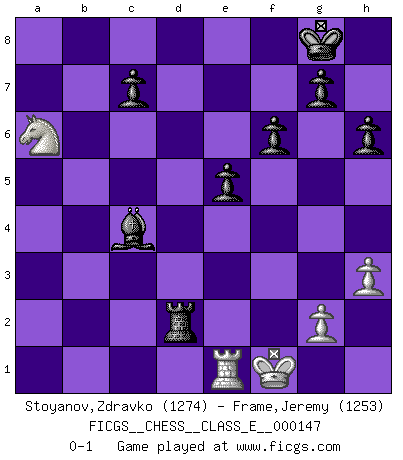 Last move : 0-1 2012 February 1 16:36:37 [Event "FICGS__CHESS__CLASS_E__000147"] [Site "FICGS"] [Date "2012.01.24"] [Round "1"] [White "Stoyanov,Zdravko"] [Black "Frame,Jeremy"] [Result "0-1"] [WhiteElo "1274"] [BlackElo "1253"] 1.e4 e5 2.Nf3 Nc6 3.h3 Bc5 4.Bb5 d6 5.Bxc6+ bxc6 6.O-O Nf6 7.d3 Be6 8.Re1 h6 9.a3 a5 10.Nc3 O-O 11.Na4 Ba7 12.Bd2 Nd7 13.Bxa5 Bxf2+ 14.Kxf2 Rxa5 15.c4 Qa8 16.Nc3 Nc5 17.b4 Rxa3 18.bxc5 Qa5 19.Rxa3 Qxa3 20.Ne2 Qxc5+ 21.Kf1 Ra8 22.Qb3 Ra3 23.Qb1 Qa7 24.Qb2 Rxd3 25.Nc1 Ra3 26.Nd2 f6 27.Ncb3 Ra2 28.Qc1 d5 29.cxd5 cxd5 30.exd5 Bxd5 31.Qc5 Qxc5 32.Nxc5 Rxd2 33.Na6 Bc4+ 0-1 King's pawn game Kingside Castling by player White (move 6) Kingside Castling by player Black (move 10) Player Black won this chess game. Follow this game move after move (download)First-class players lose to second-class players because second-class players sometimes play a first-class game. (Siegbert Tarrasch) Die Fehler sind da, Sie warten nur darauf gemacht zu werden. (Savielly Grigorievitsch Tartakower) El jugador táctico debe saber que hacer cuando algo se debe de hacer. El estratégico debe saber que hacer cuando nada se debe de hacer. (Savielly Tartakover) Plusieurs personnes se sont demandées comment Tal faisait pour gagner... En fait, c'est très simple ! Il met ses pièces au centre de l'échiquier et les sacrifie quelque part ! (David Bronstein) Vladimir Ras-Putin is still alive... He is also a good actor, I saw him in the Lord of the Rings. (Rodolfo d'Ettorre)