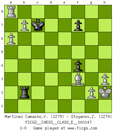 Last move : 1-0 2012 February 22 18:58:11 [Event "FICGS__CHESS__CLASS_E__000147"] [Site "FICGS"] [Date "2012.01.24"] [Round "1"] [White "Martinez Camacho,Victor Hugo"] [Black "Stoyanov,Zdravko"] [Result "1-0"] [WhiteElo "1279"] [BlackElo "1274"] 1.e4 c5 2.Nf3 a6 3.d4 cxd4 4.Nxd4 e5 5.Nf3 Nc6 6.c4 h6 7.Nc3 d6 8.h3 Nf6 9.Be3 Be7 10.Be2 O-O 11.O-O Bd7 12.Qd2 Qc8 13.Kh2 Be6 14.b3 Bd7 15.a3 Nh5 16.b4 Nf6 17.Rfd1 Be6 18.Rab1 Kh7 19.a4 Rd8 20.Qc2 Rb8 21.b5 axb5 22.cxb5 Na5 23.Bb6 Bb3 24.Rxb3 Nxb3 25.Bxd8 Nd4 26.Nxd4 exd4 27.Bxe7 Qxc3 28.Qxc3 dxc3 29.Bxf6 gxf6 30.Bd3 Rc8 31.e5 Kg7 32.exd6 Rd8 33.Bc2 h5 34.d7 Kf8 35.Rd5 Ke7 36.Rxh5 Rxd7 37.Rc5 Rd2 38.Rxc3 Rxf2 39.Be4 Kd6 40.Bxb7 Ra2 41.Rc6+ Ke5 42.Ra6 f5 43.Bf3 f4 44.b6 Kd6 45.Ra7 Rb2 46.b7 Kc7 47.a5 Kb8 48.Ra8+ Kc7 49.a6 1-0 Sicilian : O'Kelly variation Kingside Castling by player Black (move 10) Kingside Castling by player White (move 11) Player White won this chess game. Follow this game move after move (download)A Chess game is a dialogue, a conversation between a player and his opponent. Each move by the opponent may contain threats or be a blunder, but a player cannot defend against threats or take advantage of blunders if he does not first ask himself: What is my opponent planning after each move ? (Bruce A. Moon) Privat ist Kortschnoi kein schlechter Mensch, sehr sympathisch. Aber während des Spiels ist er grausam. Er will dich töten. (Miguel Najdorf) EL Ajedrez es como la vida. (Boris Spassky) Echiquier : carré parfait, comme la Jérusalem nouvelle décrite par l'auteur de l'Apocalypse, huit cases sur huit, exaltation du chiffre 4, symbole du cosmos aux quatre horizons... où le noir et le blanc, l'ombre et la lumière, le mal et le bien s'entremêlent et se conjuguent. (Robert Couffignal, Le Gambit du poète) If only people were all showed a certain minimum level of niceness; if only people didn't retract verbal draw offers (without draw box ticked) on ficgs; if only people didn't kill; if only people didn't run concentration / extermination camps, if only people didn't drop nuclear bombs on Hiroshima and Nagasaki, and so on - it would be a much more beautiful world. But sadly, things are not so... (Normajean Yates)