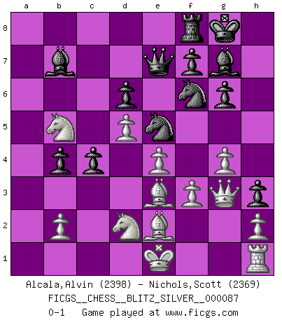 Last move : 0-1 2012 January 26 18:34:15 [Event "FICGS__CHESS__BLITZ_SILVER__000087"] [Site "FICGS"] [Date "2012.01.26"] [Round "1"] [White "Alcala,Alvin"] [Black "Nichols,Scott"] [Result "0-1"] [WhiteElo "2398"] [BlackElo "2369"] 1.d4 Nf6 2.c4 g6 3.Nc3 Bg7 4.e4 d6 5.f3 O-O 6.Be3 c5 7.Nge2 b6 8.Qd2 Nc6 9.d5 Ne5 10.Ng3 h5 11.Be2 h4 12.Nf1 a6 13.a4 e6 14.Bg5 h3 15.g4 exd5 16.cxd5 c4 17.Qf4 Rb8 18.Qg3 b5 19.axb5 axb5 20.Nd2 Qc7 21.Be3 b4 22.Ra7 Rb7 23.Nb5 Qe7 24.Rxb7 Bxb7 0-1 This chess game has been lost on time (started : 2012.01.26 15:20:19) King's Indian : Saemisch, 5...O-O Kingside Castling by player Black (move 5) Player Black won this chess game. Follow this game move after move (download)A big shock; the best chess player in history has passed away. (Lajos Portisch, about Bobby Fischer's death) Er war ein guter Schachspieler, aber ich kann Leute nicht ausstehen, die 'Heil Hitler' rufen (Über Alexander Aljechin). (Miguel Najdorf) Yo creo que el Ajedrez posee una magia que es también una ayuda en la edad avanzada. Una rodilla reumática es olvidada durante una partida de Ajedrez y otros eventos pueden parecer algo sin importancia comparada a una catástrofe en el tablero de Ajedrez. (Vlastimil Hort) La guerre est enfant de la passion, la passion est enfant du narcissisme et le narcissisme est l'enfant. (...) Une autre partie ? (Thibault de Vassal) Once you start thinking you have nothing left to learn, you have everything to learn. (Steve Badget)