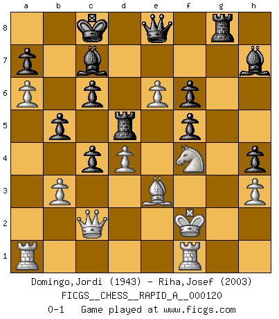 Last move : 0-1 2012 March 3 20:57:52 [Event "FICGS__CHESS__RAPID_A__000120"] [Site "FICGS"] [Date "2012.01.29"] [Round "1"] [White "Domingo,Jordi"] [Black "Riha,Josef"] [Result "0-1"] [WhiteElo "1943"] [BlackElo "2003"] 1.g4 d5 2.h3 c6 3.d4 h5 4.g5 Bf5 5.Bg2 e6 6.c4 Bb4+ 7.Nc3 dxc4 8.e4 Bg6 9.Nge2 Nd7 10.f4 Ne7 11.O-O h4 12.a3 Bd6 13.f5 exf5 14.e5 Bc7 15.Nf4 Nb6 16.Be3 Qd7 17.Qc2 O-O-O 18.a4 Bh7 19.b3 f6 20.e6 Qe8 21.gxf6 gxf6 22.a5 Nbd5 23.Ncxd5 Nxd5 24.Bxd5 Rxd5 25.a6 Rg8+ 26.Kf2 b5 0-1 Grob's attack Kingside Castling by player White (move 11) Queenside Castling by player Black (move 17) Player Black won this chess game. Follow this game move after move (download)Alekhine is a poet who creates a work of art out of something that would hardly inspire another man to send home a picture post card. (Max Euwe) Es ist peinlich, dass ich nie Weltmeister wurde. Es wäre leicht, Leonid Breschnjew als Ursache vorzuschieben, dessen Apparat den Vorzeigekommunisten Anatoli Karpow in allem unterstützte. Aber Garri Kasparow zum Beispiel, der ebenfalls von den Sowjets unerwünscht war, hat trotz der Widerstände den WM-Titel erobert. (Viktor Kortschnoi) El Ajedrez es imaginación. (David Bronstein) Dieu déplace le joueur, et celui-ci la pièce. Quel Dieu derrière Dieu commence donc la trame ? Arturo Perez-Reverte (prix de littérature policière 1993). To be champion requires more than simply being a strong player; one has to be a strong human being as well. (Anatoly Karpov)