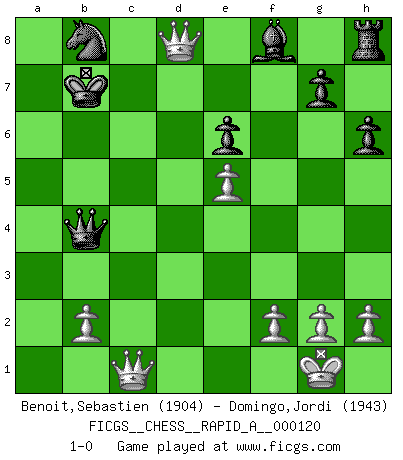 Last move : 1-0 2012 April 17 19:49:58 [Event "FICGS__CHESS__RAPID_A__000120"] [Site "FICGS"] [Date "2012.01.29"] [Round "1"] [White "Benoit,Sebastien"] [Black "Domingo,Jordi"] [Result "1-0"] [WhiteElo "1904"] [BlackElo "1943"] 1.e4 h6 2.Nf3 a6 3.d4 e6 4.Bd3 b5 5.O-O c5 6.c3 Bb7 7.Qe2 cxd4 8.cxd4 Nc6 9.Nc3 Rc8 10.d5 Na5 11.Rd1 Qc7 12.Nxb5 axb5 13.Bxb5 Nf6 14.Bd2 Be7 15.Rac1 Qd8 16.Rxc8 Bxc8 17.d6 Bf8 18.e5 Nd5 19.Nd4 Qb6 20.Rc1 Bb7 21.Bxa5 Qxa5 22.Nb3 Qb6 23.a4 Bc6 24.a5 Qb7 25.Bxc6 dxc6 26.Nd4 Nb4 27.a6 Nxa6 28.Rxc6 Nb8 29.Rc7 Qb4 30.d7+ Kd8 31.Qd1 Kxc7 32.Nxe6+ fxe6 33.d8Q+ Kb7 34.Qc1 1-0 Carr's defense Kingside Castling by player White (move 5) Promotion Queen by player White (move 33) Player White won this chess game. Follow this game move after move (download)I love all positions. Give me a difficult positional game, I will play it. But totally won positions, I cannot stand them. (Hein Donner) Wenn Dein Gegner dir ein Remis anbietet, versuch herauszufinden, weshalb er glaubt schlechter zu stehen. (Nigel Short) Al jugar al Ajedrez entonces, podemos aprender: Primero: Previsión... Segundo: Prudencia... Tercero: Cautela... Y al final, aprendemos del Ajedrez el hábito de no ser desanimados por apariencias malas presentes en el estado de nuestros asuntos, el hábito de la esperanza por una oportunidad favorable y la perseveración de los secretos de los recursos. (Benjamin Franklin) Le temps de noter son nom sur la feuille de partie, j'étais déjà en zeitnot ! D'un modeste amateur apparié lors de la première ronde d'un open contre le grand-maître Azmaïparashvili. Establishing goals is all right if you don't let them deprive you of interesting detours. (Doug Larson)