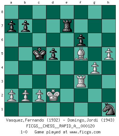 Last move : 1-0 2012 June 2 0:40:7 [Event "FICGS__CHESS__RAPID_A__000120"] [Site "FICGS"] [Date "2012.01.29"] [Round "1"] [White "Vasquez,Fernando"] [Black "Domingo,Jordi"] [Result "1-0"] [WhiteElo "1932"] [BlackElo "1943"] 1.e4 g5 2.d4 h6 3.Nc3 d6 4.f4 Bg7 5.fxg5 hxg5 6.Bxg5 c5 7.dxc5 Qa5 8.Qd2 Qxc5 9.Nd5 Be6 10.Be3 Qc8 11.Bd4 Bxd4 12.Qxd4 Rh7 13.Nf3 Nc6 14.Qd2 Qd7 15.O-O-O O-O-O 16.Bb5 Bg4 17.Rdf1 Rg7 18.h3 Bxf3 19.Rxf3 Kb8 20.Ra3 Rc8 21.Qf2 Nf6 22.g4 Nxe4 23.Bxc6 Nxf2 24.Bxd7 Nxh1 25.Bxc8 e6 26.Ne7 f6 27.Nf5 exf5 28.Bxf5 Re7 29.Kd2 Kc7 30.Rc3+ Kb6 31.Rf3 Kc5 32.h4 d5 33.h5 1-0 Reversed Grob (Borg/Basman defense/macho Grob) Queenside Castling by player White (move 15) Queenside Castling by player Black (move 15) Player White won this chess game. Follow this game move after move (download)A big shock; the best chess player in history has passed away. (Lajos Portisch, about Bobby Fischer's death) In Buenos Aires ist es nicht mein vorrangiges Ziel ein starkes Turnier zu organisieren, sondern ein Turnier für Gentlemen. Ich würde nie Kamsky einladen. Ich mag keine Probleme. (Miguel Najdorf) Una compensación adecuada por un sacrificio es tener una combinación sólida que conduce a una posición ganadora; una compensación adecuada por una metida de pata es dejar a tu oponente arrebatar una derrota de las fauces de la victoria. (Bruce A. Moon) J'ai toujours senti une vague pitié pour l'homme qui ne connaît rien aux échecs, tout comme j'en aurais pour un homme ignorant de l'amour. Les Echecs, comme la musique ou comme l'amour, ont le pouvoir de rendre heureux. (Siegbert Tarrasch) See no evil, hear no evil, speak no evil. (The 3 monkeys)