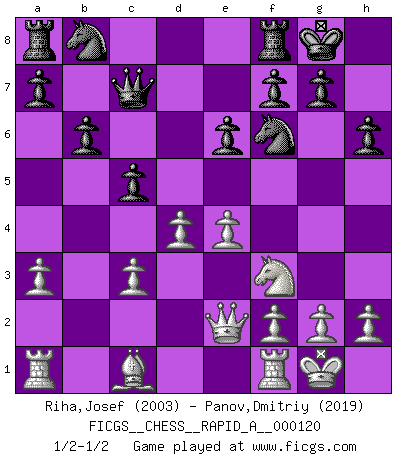 Last move : 1/2-1/2 2012 February 3 18:4:16 [Event "FICGS__CHESS__RAPID_A__000120"] [Site "FICGS"] [Date "2012.01.29"] [Round "1"] [White "Riha,Josef"] [Black "Panov,Dmitriy"] [Result "1/2-1/2"] [WhiteElo "2003"] [BlackElo "2019"] 1.d4 Nf6 2.c4 e6 3.Nc3 Bb4 4.e3 O-O 5.Bd3 d5 6.a3 Bxc3+ 7.bxc3 dxc4 8.Bxc4 c5 9.Nf3 Qc7 10.Be2 b6 11.O-O Ba6 12.Bxa6 Nxa6 13.Qe2 Nb8 14.e4 h6 1/2-1/2 Nimzo-Indian : 4.e3, Botvinnik system Kingside Castling by player Black (move 4) Kingside Castling by player White (move 11) This chess game ended in a draw. Follow this game move after move (download)There is no remorse like the remorse of Chess. (H. G. Wells) Spielt Blackmar-Diemer-Gambit, und das Matt kommt von selbst! (Emil Joseph Diemer) Yo considero que Fischer es uno de los expertos mas grandes de aperturas de siempre. (Keith Hayward) Les échecs sont un jeu par leur forme, un art par leur essence et une science par sa difficulté d'acquisition. Ils peuvent vous procurer autant de plaisir qu'un bon livre ou une belle musique, mais vous n'aurez une réelle joie que si vous arrivez à bien jouer. (Tigran Petrosian) Animated gif is worth one mega-word. (Unknown)