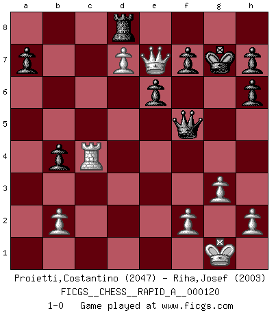 Last move : 1-0 2012 February 19 11:13:42 [Event "FICGS__CHESS__RAPID_A__000120"] [Site "FICGS"] [Date "2012.01.29"] [Round "1"] [White "Proietti,Costantino"] [Black "Riha,Josef"] [Result "1-0"] [WhiteElo "2047"] [BlackElo "2003"] 1.e4 c6 2.d4 d5 3.e5 c5 4.dxc5 e6 5.Be3 Nh6 6.Nf3 Nd7 7.Bxh6 gxh6 8.c4 Bg7 9.cxd5 Nxe5 10.Nc3 O-O 11.Nxe5 Bxe5 12.Qg4+ Kh8 13.d6 Qa5 14.Qc4 b5 15.Qd3 Qb4 16.Rd1 Qxc5 17.Be2 Bb7 18.O-O b4 19.Na4 Qa5 20.Qe3 Rg8 21.g3 Bf6 22.Nc5 Bc6 23.d7 Qxa2 24.Bf3 Bxf3 25.Qxf3 Kg7 26.Rd2 Rab8 27.Qg4+ Kh8 28.Qf4 Kg7 29.Ne4 Be7 30.Nd6 Bxd6 31.Qxd6 Qa5 32.Rd4 Rbd8 33.Rg4+ Kh8 34.Rxg8+ Kxg8 35.Rc1 Kg7 36.Rc4 Qf5 37.Qe7 1-0 Comment by player 1 : Costantino Proietti : In this game Black played the opening very well. 3...c5 is a sharp move so the variation played forced Black to be very precise as his position could suddenly collpase (like in this game). Moves 8...Bg7!? and 14...b5! got equality. Unfortunately he doesn't find the correct move to W. 18. 0-0. Black moves 18..b4 and 19...Qa5 are clearly wrong. After these moves White has just a winning game. Caro-Kann : Advance variation Kingside Castling by player Black (move 10) Kingside Castling by player White (move 18) Player White won this chess game. Follow this game move after move (download)Winning isn't everything... but losing is nothing. (Mednis) Besser ein falscher Plan, logisch durchgeführt, als gar kein Plan. (Viktor Kortschnoi) Aquel que teme a un Peón de Reina aislado, debería de retirarse del Ajedrez. (Siegbert Tarrasch) Des combinaisons [dans le jeu d'échecs] pareilles à des mélodies. Je crois entendre pour ainsi dire la musique des coups... (Vladimir Nabokov) Big Chess is a place for big hallucinations. (Thibault de Vassal)