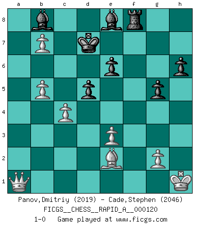 Last move : 1-0 2012 March 26 15:12:37 [Event "FICGS__CHESS__RAPID_A__000120"] [Site "FICGS"] [Date "2012.01.29"] [Round "1"] [White "Panov,Dmitriy"] [Black "Cade,Stephen"] [Result "1-0"] [WhiteElo "2019"] [BlackElo "2046"] 1.e4 e6 2.d4 d5 3.e5 c5 4.c3 Nc6 5.Nf3 Bd7 6.Be2 f6 7.O-O fxe5 8.Nxe5 Nxe5 9.dxe5 Qc7 10.Bf4 O-O-O 11.a4 Ne7 12.Na3 a6 13.b4 h6 14.Nb5 axb5 15.axb5 Qb8 16.bxc5 g5 17.Be3 Bg7 18.Ra2 Bxe5 19.Qa1 Bxh2+ 20.Kh1 Nf5 21.Ra8 Nxe3 22.fxe3 Rdf8 23.Rxf8+ Rxf8 24.c6 Be8 25.cxb7+ Kd7 26.Rxb8 Bxb8 27.c4 1-0 French : Advance, Euwe variation Kingside Castling by player White (move 7) Queenside Castling by player Black (move 10) Player White won this chess game. Follow this game move after move (download)No price is too great for the scalp of the enemy King. (Koblentz) Jeder weiß, dass Gasprom Putins persönliches Machtinstrument ist. Die Firma wird vom Kreml aus geleitet und wird schon deshalb nie transparent sein. (Garry Kasparov) El Ajedrez es un mar en el cual un mosquito puede beber y un elefante puede bañarse. (Refrán Hindú) Je menace de comprendre la position. (Anonyme) The best weapon against an enemy is another enemy. (Friedrich Nietzsche)
