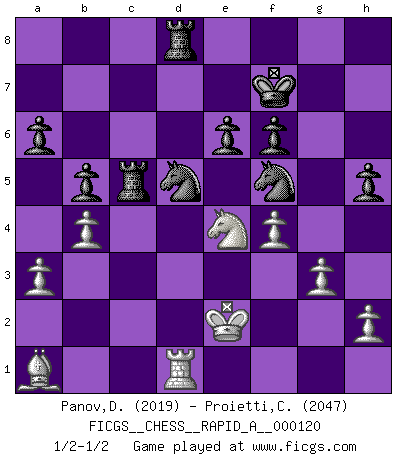 Last move : 1/2-1/2 2012 March 14 7:6:9 [Event "FICGS__CHESS__RAPID_A__000120"] [Site "FICGS"] [Date "2012.01.29"] [Round "1"] [White "Panov,Dmitriy"] [Black "Proietti,Costantino"] [Result "1/2-1/2"] [WhiteElo "2019"] [BlackElo "2047"] 1.e4 c5 2.c3 Nf6 3.e5 Nd5 4.d4 cxd4 5.cxd4 d6 6.Nf3 Nc6 7.Bc4 dxe5 8.dxe5 Ndb4 9.Qb3 e6 10.Nc3 Na5 11.Qa4+ Bd7 12.Bb5 Bxb5 13.Qxb5+ Nac6 14.Ke2 a6 15.Qc4 Na5 16.Qe4 Qc7 17.Rd1 Qc4+ 18.Qxc4 Nxc4 19.b3 Nb6 20.Ne4 N6d5 21.a3 Nc6 22.Bb2 Be7 23.g3 O-O 24.Rac1 Rfd8 25.Nfd2 f5 26.exf6 gxf6 27.b4 Rac8 28.f4 Kf7 29.Nc4 h5 30.Nc5 b5 31.Nd2 Bxc5 32.Rxc5 Nce7 33.Ne4 Nf5 34.Ba1 Rxc5 1/2-1/2 Sicilian : Alapin's variation (2.c3) Kingside Castling by player Black (move 23) This chess game ended in a draw. Follow this game move after move (download)The passed Pawn is a criminal, who should be kept under lock and key. Mild measures, such as police surveillance, are not sufficient. (Aaron Nimzovich) Pläne sind die Träume des Verständigen. (Ernst Freiherr von Feuchtersleben) Haz el enroque temprano y seguido. (Rob Sillars) Le jeu d'échecs est comme rejeté hors du temps. (Antoine de Saint-Exupéry) Wawaweewa ! (Borat: Cultural learnings of America for make benefit glorious nation of Kazakhstan)