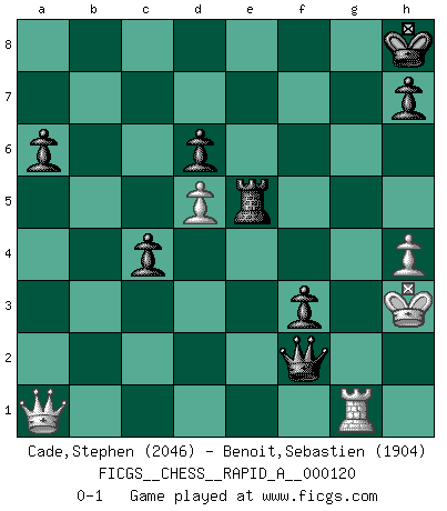 Last move : 0-1 2012 April 24 11:48:48 [Event "FICGS__CHESS__RAPID_A__000120"] [Site "FICGS"] [Date "2012.01.29"] [Round "1"] [White "Cade,Stephen"] [Black "Benoit,Sebastien"] [Result "0-1"] [WhiteElo "2046"] [BlackElo "1904"] 1.d4 Nf6 2.c4 c5 3.d5 e6 4.Nc3 exd5 5.cxd5 d6 6.Nf3 g6 7.Bf4 a6 8.a4 Qe7 9.h3 Nbd7 10.e3 Bg7 11.Be2 O-O 12.O-O Rb8 13.Bh2 Ne8 14.Nd2 b6 15.e4 Nc7 16.Nc4 Ne5 17.Ne3 f5 18.exf5 gxf5 19.Re1 f4 20.Nc4 Nxc4 21.Bxc4 Qg5 22.Qf3 b5 23.Bd3 c4 24.Bb1 Be5 25.Be4 Bd7 26.axb5 Nxb5 27.Ne2 Nd4 28.Nxd4 Bxd4 29.Rab1 Rb3 30.Qd1 f3 31.g4 Bc5 32.Bg3 Bxg4 33.h4 Qg7 34.Kh2 Kh8 35.Bc2 Bf5 36.Rg1 Rxb2 37.Rxb2 Qxb2 38.Bxf5 Bxf2 39.Bxf2 Qxf2+ 40.Kh3 Rxf5 41.Qa1+ Re5 0-1 Benoni defense Kingside Castling by player Black (move 11) Kingside Castling by player White (move 12) Player Black won this chess game. Follow this game move after move (download)Life is like a game of Chess, changing with each move. (Chinese proverb) Wenn ich Weiß habe gewinne ich weil ich Weiß habe, wenn ich Schwarz habe gewinne ich weil ich Bogoljubov bin. (Efim Bogoljubov) Si no le temes a Spassky, entonces elimino el elemento del dinero. (Jim Slater) Vous m'avez demandé de vous exposer quel est le fondement de la prière. Je ne fais que préparer les pièces du jeu sur la table... Nous sera-t-il permis d'en adopter les règles et si nous les appliquons scrupuleusement nous ne tarderons pas à faire mat le Roi divin ! Il ne pourra échapper à nos mains. (Sainte Thérèse d'Avila, Chemin de perfection) CHESS, n. f. [echecs, Fr.] A nice and abstruse game, in which two sets of puppets are moved in opposition to each other. (Dr Samuel Johnson, A Dictionary Of The English Language, 1755)