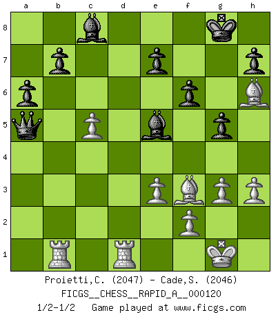 Last move : 1/2-1/2 2012 March 6 11:17:9 [Event "FICGS__CHESS__RAPID_A__000120"] [Site "FICGS"] [Date "2012.01.29"] [Round "1"] [White "Proietti,Costantino"] [Black "Cade,Stephen"] [Result "1/2-1/2"] [WhiteElo "2047"] [BlackElo "2046"] 1.d4 Nf6 2.c4 g6 3.Nc3 d5 4.Bf4 Bg7 5.e3 c5 6.dxc5 Qa5 7.Rc1 dxc4 8.Bxc4 O-O 9.Nf3 Qxc5 10.Bb3 Qa5 11.h3 Ne4 12.O-O Nxc3 13.bxc3 Nd7 14.Bg5 Re8 15.Bc4 Nb6 16.Bb3 Bd7 17.c4 Rad8 18.c5 Na4 19.Ne5 Be6 20.Qc2 Bxe5 21.Bxa4 Rd2 22.Qxd2 Qxd2 23.Bxe8 f6 24.Rfd1 Qxa2 25.Bh6 Qa5 26.Rb1 a6 27.g3 g5 28.Bh5 Bc8 29.Bf3 1/2-1/2 King's Indian defense, 3.Nc3 Kingside Castling by player Black (move 8) Kingside Castling by player White (move 12) This chess game ended in a draw. Follow this game move after move (download)Avoid the crowd. Do your own thinking independently. Be the Chess player, not the Chess piece. (Ralph Charell) Eine Person mit durchschnittlichem IQ kann etwa eine ELO von 2000 erreichen. (Jonathan Levitt) No es suficiente ser un buen jugador, se debe también de jugar bién. (Siegbert Tarrasch) Les écrivains ont utilisé les échecs pour analyser les côtés extrêmes de la nature humaine. Dans ce cadre, les échecs offrent un champ d'expérimentation idéal. Mais on pourrait faire la même chose avec la peinture. Et là, en vous référant à Van Gogh, vous ne tirerez pas de conclusion définitive sur les peintres. (Gary Kasparov) Life is verb, not a noun. (Charlotte Perkins Gilman)