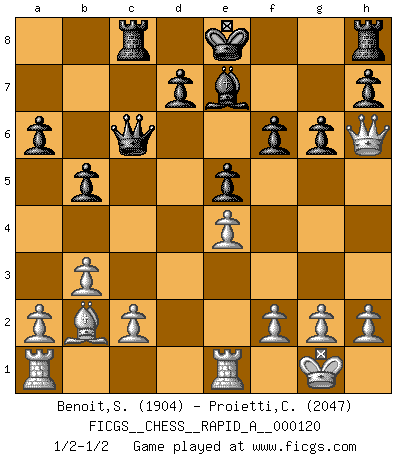 Last move : 1/2-1/2 2012 February 17 19:48:0 [Event "FICGS__CHESS__RAPID_A__000120"] [Site "FICGS"] [Date "2012.01.29"] [Round "1"] [White "Benoit,Sebastien"] [Black "Proietti,Costantino"] [Result "1/2-1/2"] [WhiteElo "1904"] [BlackElo "2047"] 1.e4 c5 2.Nf3 Nc6 3.Bb5 Qb6 4.Nc3 e6 5.O-O Nge7 6.Re1 a6 7.Bxc6 Nxc6 8.b3 Be7 9.Bb2 f6 10.d4 Nxd4 11.Nxd4 cxd4 12.Na4 Qc6 13.Bxd4 b5 14.Nb6 Rb8 15.Nxc8 Rxc8 16.Qh5+ g6 17.Qh6 Bf8 18.Qh4 e5 19.Bb2 Bc5 20.Qh6 Bf8 21.Qh4 Be7 22.Qh6 1/2-1/2 Comment by player 2 : Costantino Proietti : 3...Qb6!? is not the most played move. Most common is 3...g6. My opponent with 7. Bxc6 tries to maintain a little advantage with the interesting varition 8.b3 Be7 9.Bb2 0-0?! 10.Nd5! exd5 11.exd5 Qd8 12.dxc6 with initiative. But Black had analized a novelty: 9..f6! After 10. d4! White continues to play very actively but B. with 10...Nxd4 is accurate. 10...cxd4 is wrong and gives to W. a dangerous attack after 11. Nd5! (again!)11..exd5 12. exd5. W. move 17.Qh6 forces black to accept draw. Sicilian : Nimzovich-Rossolimo attack (without ...d6) Kingside Castling by player White (move 5) This chess game ended in a draw. Follow this game move after move (download)Chess, like any creative activity, can exist only through the combined efforts of those who have creative talent, and those who have the ability to organize their creative work. (Mikhail Botvinnik) Wenn ein Kopf und ein Buch zusammenstoßen und es klingt hohl, ist es denn allemal im Buche? (Georg Christoph Lichtenberg) Hay jugadores fuertes y personas amables y yo soy un jugador fuerte. (Bobby Fischer) Pour se monter efficace, un Cavalier a besoin d'avant-postes ! Les Cavaliers font les meilleurs bloqueurs de pions passés. The next best thing to gambling and winning is gambling and loosing. (Nick Dandalos)