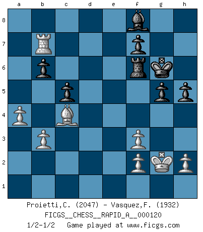 Last move : 1/2-1/2 2012 May 8 13:39:53 [Event "FICGS__CHESS__RAPID_A__000120"] [Site "FICGS"] [Date "2012.01.29"] [Round "1"] [White "Proietti,Costantino"] [Black "Vasquez,Fernando"] [Result "1/2-1/2"] [WhiteElo "2047"] [BlackElo "1932"] 1.e4 e5 2.Nf3 Nf6 3.Nxe5 d6 4.Nf3 Nxe4 5.d4 d5 6.Bd3 Nc6 7.O-O Be7 8.Re1 Bg4 9.c4 Nf6 10.Nc3 Nxd4 11.cxd5 Bxf3 12.gxf3 c5 13.d6 Qxd6 14.Nb5 Nxb5 15.Bxb5+ Kf8 16.Qxd6 Bxd6 17.Be3 Be7 18.a4 Rc8 19.Rad1 h6 20.Bc4 g5 21.Bd2 Rd8 22.Bc3 Rxd1 23.Rxd1 b6 24.b3 h5 25.Bxf6 Bxf6 26.Rd7 Be7 27.Rxa7 Rh6 28.Rb7 Rf6 29.Rb8+ Kg7 30.Kg2 Bf8 31.Rb7 Kg6 32.Bd3+ Kh6 33.Bc4 Kg6 34.Bd3+ Kh6 35.Bc4 Kg6 1/2-1/2 Petrov : Classical attack Kingside Castling by player White (move 7) This chess game ended in a draw. Follow this game move after move (download)A thorough understanding of the typical mating continuations makes the most complicated sacrificial combinations leading up to them not only not difficult, but almost a matter of course. (Siegbert Tarrasch) Der Knackpunkt bei der Konzentration ist, daß wir nur durch sie etwas Neues und Ungewöhnliches am Schachbrett finden können. Sie ist der einzige Weg durch neue neue Ideen eine Überraschung zu bereiten. (Garry Kasparov) El Ajedrez te enseña a controlarl la excitación inicial que sientes cuando vez algo que parece bueno y te enseña a pensar objetivamente cuando te encuentras en problemas. (Stanley Kubrick) Seul un grand joueur sait à quel point il joue faiblement. (Xavier Tartacover) I just play for fun. (Anna Kournikova)