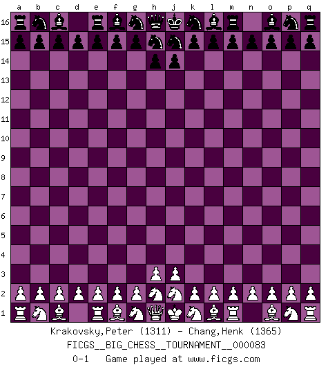Last move : 0-1 2012 January 29 22:30:36 [Event "FICGS__BIG_CHESS__TOURNAMENT__000083"] [Site "FICGS"] [Date "2012.01.29"] [Round "1"] [White "Krakovsky,Peter"] [Black "Chang,Henk"] [Result "0-1"] [WhiteElo "1311"] [BlackElo "1365"] 0-1 Follow this game move after move (download)One doesn't have to play well, it's enough to play better than your opponent. (Siegbert Tarrasch) Ich verlor meine Bürgerrechte, mein Gehalt wurde mir nicht mehr bezahlt und ich wurde zensiert und durfte nicht mehr ins Ausland reisen. [nach dem Match Fischer-Taimanov 6:0] (Mark Taimanov) Me gusta decir que Bobby Fischer fue el mejor jugador que jamás haya existido. Pero lo que hizo de Fischer un genio, fue su habilidad de mezclar una frescura y pragmatismo Americano con ideas Rusas acerca de la estrategia. (Bruce Pandolfini) Lorsque vous vous retrouvez devant une position atroce, ne tendez pas un ultime piège dérisoire avec l'intention d'abandonner si l'adversaire le déjoue ! Faites-vous plutôt un devoir de résister comme si votre vie en dépendait. Jouez le coup qui vous déplairait au centuple si vous étiez dans la peau de votre tortionnaire ! We cannot be sure of having something to live for unless we are willing to die for it. (Ernesto Che Guevara)
