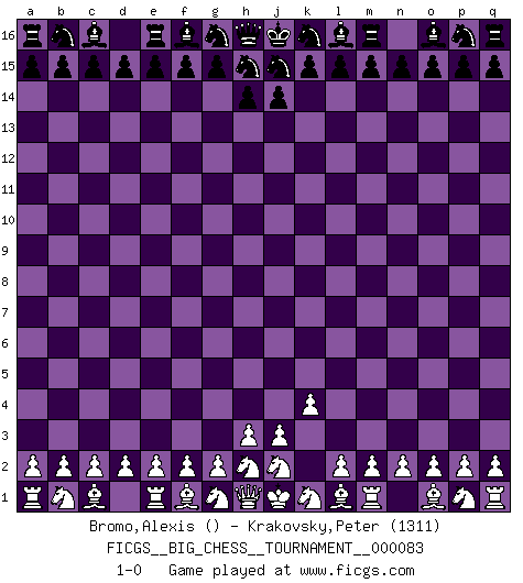 Last move : 1-0 2012 January 29 22:30:59 [Event "FICGS__BIG_CHESS__TOURNAMENT__000083"] [Site "FICGS"] [Date "2012.01.29"] [Round "1"] [White "Bromo,Alexis"] [Black "Krakovsky,Peter"] [Result "1-0"] [WhiteElo ""] [BlackElo "1311"] 1.k2-k4 1-0 Follow this game move after move (download)Chess is a fighting game which is purely intellectual and includes chance. (Richard Reti) Im Leben werden Partien nie so unstrittig gewonnen wie im Spiel (Emanuel Lasker) Te sientas frente a un tablero y repentinamente tu corazón brinca. Tu mano tiembla al tomar una pieza y moverla. Pero lo que el Ajedrez te enseña es que tu debes permanecer ahí con calma y pensar de que si realmente es una buena idea o de que si hay otras ideas mejores. (Stanley Kubrick) L'ordinateur a tué l'originalité. Il n'y a plus guère d'aventures sur l'échiquier. (Jacob Murray) If everyone is thinking alike, then somebody isn't thinking. (US General George S. Patton)