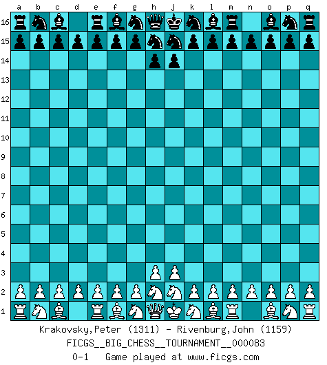 Last move : 0-1 2012 January 29 22:30:44 [Event "FICGS__BIG_CHESS__TOURNAMENT__000083"] [Site "FICGS"] [Date "2012.01.29"] [Round "1"] [White "Krakovsky,Peter"] [Black "Rivenburg,John"] [Result "0-1"] [WhiteElo "1311"] [BlackElo "1159"] 0-1 Follow this game move after move (download)Any material change in a position must come about by mate, a capture, or a Pawn promotion. (Purdy) Ich würde die 30 stärksten Spieler der USA im Simultanspiel besiegen. (José Raúl Capablanca) Existen dos clases de sacrificios: los correctos y los míos. (Mikhail Tal) Il vaut toujours mieux jouer un plan faux de façon logique que de n'avoir pas de plan du tout. (Victor Kortchnoï) If I had no sense of humor, I would long ago have committed suicide. (Mahatma Gandhi)