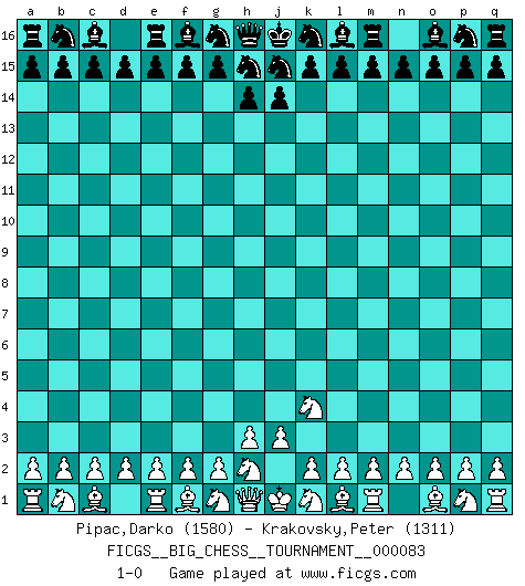 Last move : 1-0 2012 January 29 22:31:6 [Event "FICGS__BIG_CHESS__TOURNAMENT__000083"] [Site "FICGS"] [Date "2012.01.29"] [Round "1"] [White "Pipac,Darko"] [Black "Krakovsky,Peter"] [Result "1-0"] [WhiteElo "1580"] [BlackElo "1311"] 1.j2-k4 1-0 Follow this game move after move (download)Fischer is the strongest player in the world. In fact, the strongest player who ever lived. (Larry Evans) Wenn sie aufgeben, dann danke ich Ihnen für das Spiel (Eventualzug beim Fernschach). (Anonymous) Bobby solo arroja las piezas y solas caen en las casillas correctas. (Miguel Najdorf ) Vouloir jouer aux échecs contre soi-même est aussi paradoxal que vouloir marcher sur son ombre. (Stefan Zweig) The only difference between a tax man and a taxidermist is that the taxidermist leaves the skin. (Mark Twain)