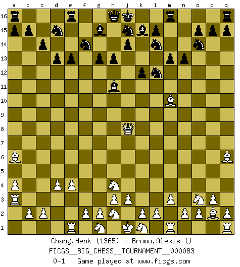Last move : 0-1 2012 March 21 21:28:29 [Event "FICGS__BIG_CHESS__TOURNAMENT__000083"] [Site "FICGS"] [Date "2012.01.29"] [Round "1"] [White "Chang,Henk"] [Black "Bromo,Alexis"] [Result "0-1"] [WhiteElo "1365"] [BlackElo ""] 1.j2-h4 k15-k13 2.h1-o7 p16-o14 3.o7-f15 g16-f14 4.f15-l10 k16-l14 5.p2-p3 d15-d13 6.o1-p2 c15-c14 7.m2-m3 g15-g13 8.l1-n3 m15-m14 9.e2-e4 n15-n13 10.f1-e2 l16-k15 11.a2-a4 e15-e13 12.a1-a3 m14-m13 13.a3-f3 f16-g15 14.e2-a6 o16-k12 15.l10-j8 h15-j13 16.b1-a3 k12-a3 17.f3-a3 h14-h13 18.d2-d4 c16-h11 19.p1-o3 b16-d15 20.n3-q6 k13-k12 21.c1-m10 j13-l12 0-1 This big chess game has been lost on time (started : 2012.01.29 18:44:49) Follow this game move after move (download)You sit at the board and suddenly your heart leaps. Your hand trembles to pick up the piece and move it. But what Chess teaches you is that you must sit there calmly and think about whether it's really a good idea and whether there are other better ideas. (Stanley Kubrick) Schach ist Krieg, im Schach geht es um testosterongesteuerte Urschreie. (Garry Kasparov) Peones: ellos son el alma de esta partida, solos forman el ataque y la defensa. (Philidor) Les Echecs ne sont pas pour les âmes timides. Ils requièrent un homme entier, qui ne s'arrête pas aveuglément à ce qui a été déjà établi, mais qui tente individuellement de sonder les profondeurs du jeu. (W. Steinitz) At work, the authority of a person is inversely proportional to the number of pens that person is carrying. (Dan Rotaru)