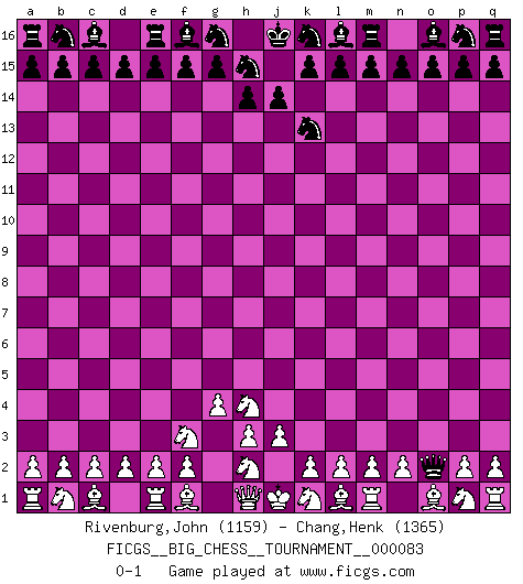 Last move : 0-1 2012 March 11 8:31:32 [Event "FICGS__BIG_CHESS__TOURNAMENT__000083"] [Site "FICGS"] [Date "2012.01.29"] [Round "1"] [White "Rivenburg,John"] [Black "Chang,Henk"] [Result "0-1"] [WhiteElo "1159"] [BlackElo "1365"] 1.g1-f3 j15-k13 2.g2-g4 h16-o10 3.j2-h4 o10-o2 0-1 This big chess game has been lost on time (started : 2012.01.29 18:44:49) Follow this game move after move (download)Nowadays, when you're not a grandmaster at 14, you can forget about it. (Anand Viswanathan) Ich habe die besten Aussichten, den ersten Preis zu gewinnen - denn jeder muss gegen Steinitz spielen, nur ich nicht! (Wilhelm Steinitz) Sin errores no puede haber brillantez. (Emanuel Lasker) Vous savez, camarade Pachman, je n'éprouve pas de plaisir à être ministre, je jouerais plutôt aux échecs comme vous, ou alors ferais une révolution au Venezuela. (Che Guevara à Ludek Pachman, 'Checkmate in Prague', 1975) Creativity is allowing yourself to make mistakes. Art is knowing which ones to keep. (Scott Adams)