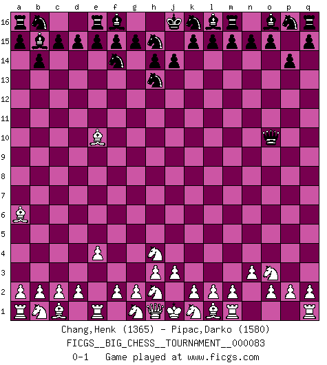 Last move : 0-1 2012 March 9 8:32:44 [Event "FICGS__BIG_CHESS__TOURNAMENT__000083"] [Site "FICGS"] [Date "2012.01.29"] [Round "1"] [White "Chang,Henk"] [Black "Pipac,Darko"] [Result "0-1"] [WhiteElo "1365"] [BlackElo "1580"] 1.j2-h4 j15-h13 2.n2-n3 b15-b14 3.e2-e4 c16-b15 4.p1-o3 p15-p14 5.f1-a6 g16-f14 6.o1-e10 h16-o10 0-1 This big chess game has been lost on time (started : 2012.01.29 18:44:49) Follow this game move after move (download)Chess opens and enriches your mind. (Saudin Robovic) Ich weiss nicht was Gott gegen mich auf 1.e4 antworten würde. (Robert James Fischer) El Ajedrez es despiadado: debes de estar preparado para matar gente. (Nigel Short) Des combinaisons [dans le jeu d'échecs] pareilles à des mélodies. Je crois entendre pour ainsi dire la musique des coups... (Vladimir Nabokov) Gambling : The sure way of getting nothing from something. (Wilson Mizner)