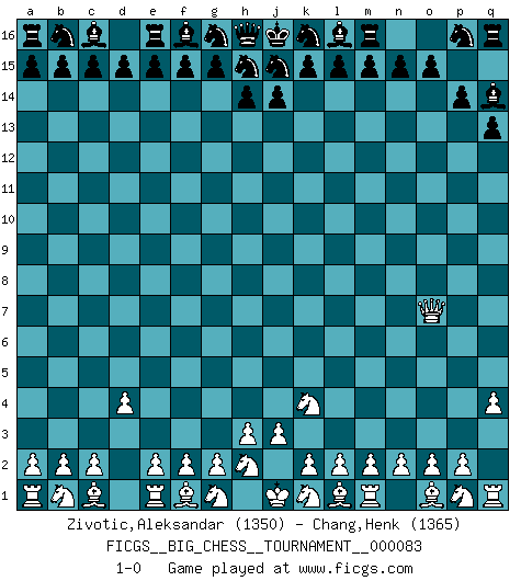 Last move : 1-0 2012 March 15 8:41:36 [Event "FICGS__BIG_CHESS__TOURNAMENT__000083"] [Site "FICGS"] [Date "2012.01.29"] [Round "1"] [White "Zivotic,Aleksandar"] [Black "Chang,Henk"] [Result "1-0"] [WhiteElo "1350"] [BlackElo "1365"] 1.q2-q4 q15-q13 2.d2-d4 p15-p14 3.j2-k4 o16-q14 4.h1-o7 1-0 This big chess game has been lost on time (started : 2012.01.29 18:44:49) Follow this game move after move (download)When you don't know what to do, wait for your opponent to get an idea - it's sure to be wrong. (Tarrasch) Rauchen ist dem Schachspieler bei seiner Arbeit, also im Wettkampf, untersagt. (Viktor Kortschnoi) Si no le temes a Spassky, entonces elimino el elemento del dinero. (Jim Slater) Karpov est une pièce de musée. (Garry Kasparov) Logic : The art of thinking and reasoning in strict accordance with the limitations and incapacities of the human misunderstanding. (Ambrose Bierce)